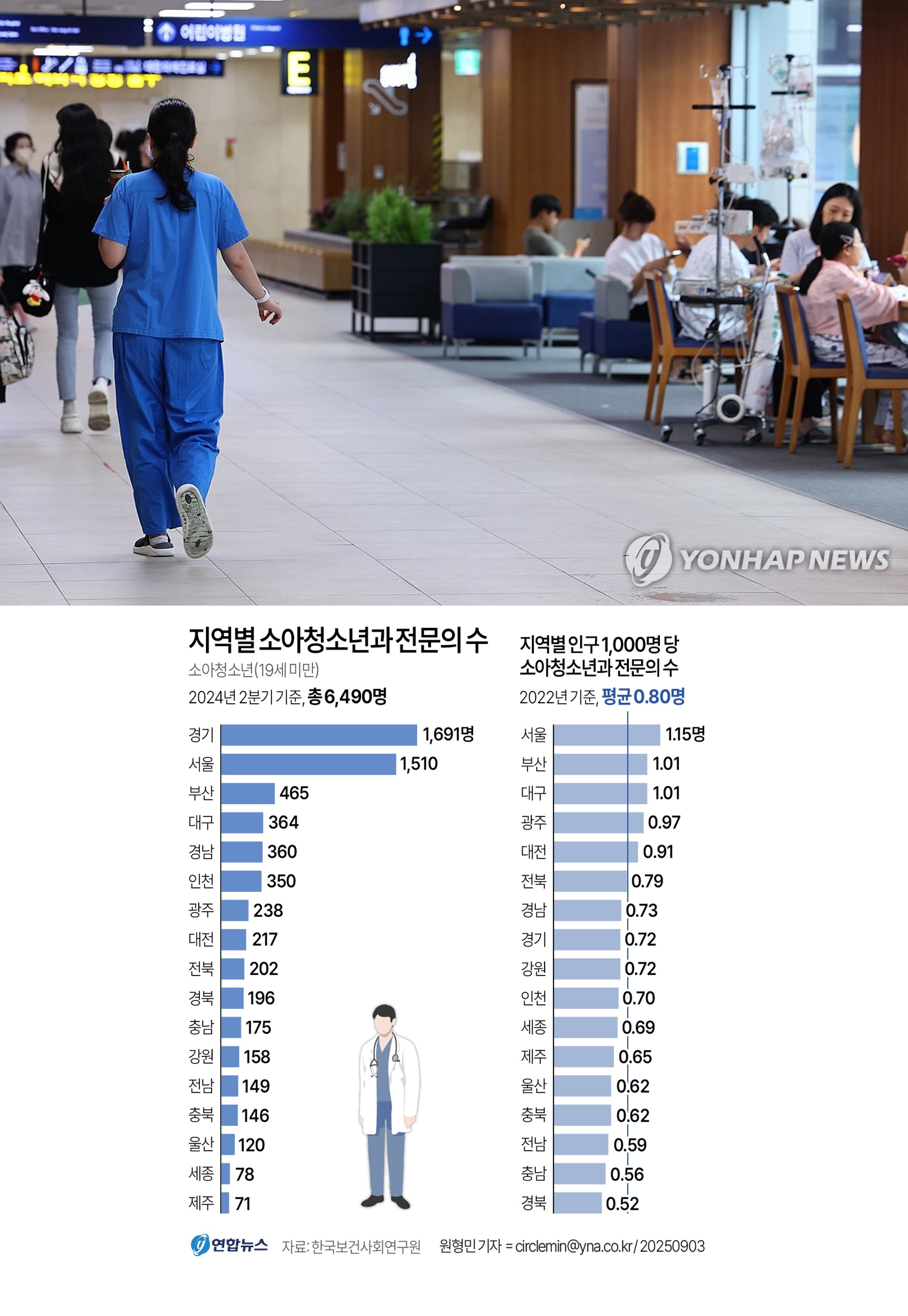 (¼¿ï=¿¬ÇÕ´º½º) ¿øÇü¹Î ±âÀÚ = 3ÀÏ Çѱ¹º¸°Ç»çȸ¿¬±¸¿øÀÇ ''¼Ò¾Æ¡¤Ã»¼Ò³â ÀÇ·áü°è °³¼±¹æ¾È¿¬±¸''¿¡ µû¸£¸é Áö³ÇØ 2ºÐ±â ±âÁØ Àü±¹ÀÇ ¼Ò¾ÆÃ»¼Ò³â°ú Àü¹®ÀÇ ¼ö´Â 6õ490¸íÀ̾ú´Ù. ¼¿ï(1õ510¸í)°ú °æ±â(1õ691¸í)°¡ ÀüüÀÇ 49%¸¦ Â÷ÁöÇß´Ù.