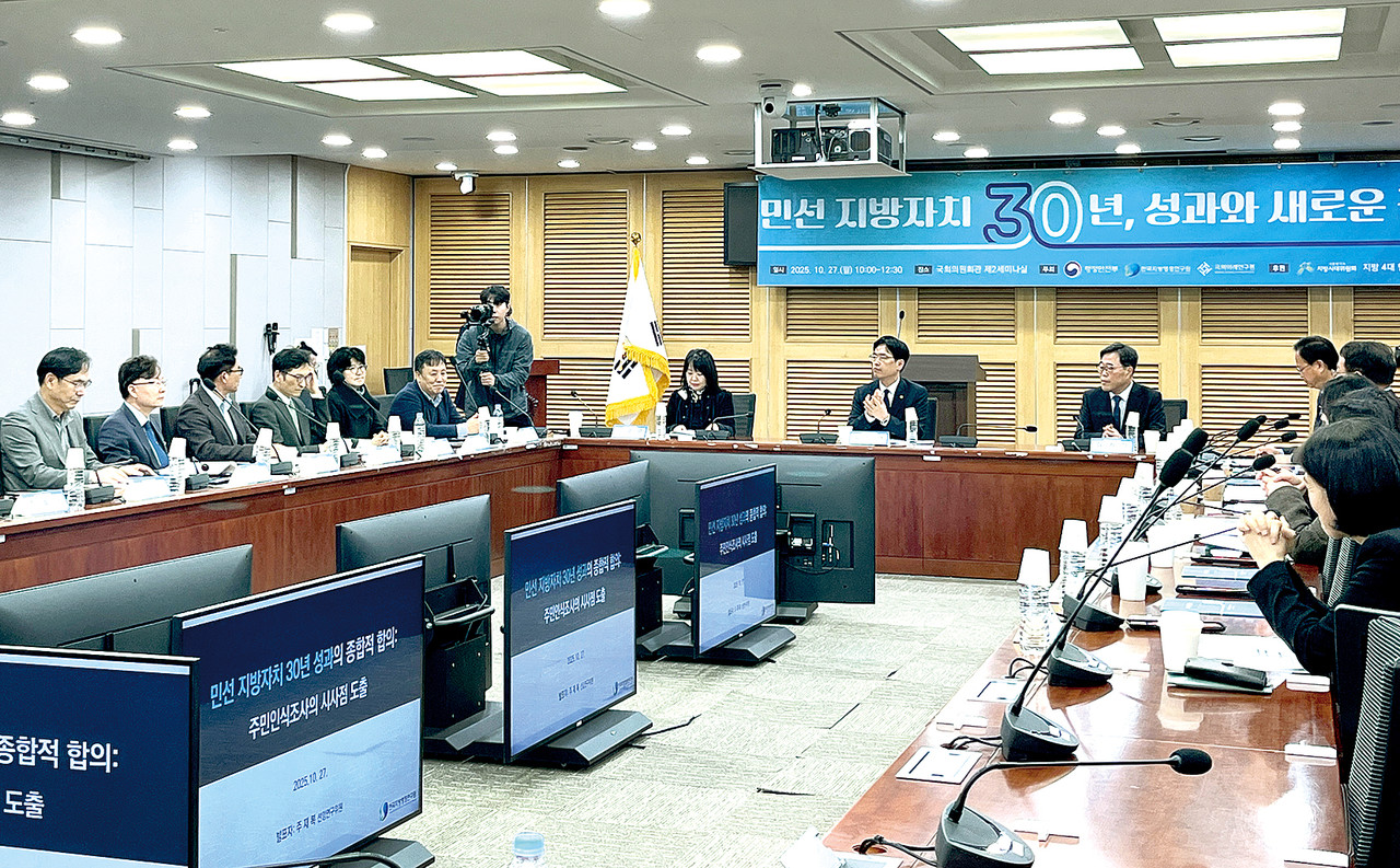 ¹Î¼± Áö¹æÀÚÄ¡°¡ µµÀÔµÈ Áö 30³âÀ» ¸Â¾ÒÁö¸¸, Á¦µµÀÇ ¼º¼÷¿¡ ºñÇØ ÁֹΠü°¨µµ´Â ¿©ÀüÈ÷ ³·´Ù´Â Æò°¡°¡ ³ª¿Ô´Ù. ÀÌ¿¡ µû¶ó ÁÖ¹ÎÀÌ Á÷Á¢ º¯È¸¦ ´À³¥ ¼ö ÀÖ´Â »ýȰü°¨Çü ¼º°ú¸¦ È®´ëÇϰí, Àα¸ º¯È¿¡ ¸Â´Â Áö¹æÀçÁ¤Á¶Á¤Á¦µµ °³Æí µî ÀçÁ¤ ±â¹Ý °È¸¦ ÅëÇØ ½ÇÁúÀûÀÎ Áö¹æÀÚÄ¡¸¦ ±¸ÇöÇØ¾ß ÇÑ´Ù´Â Á¦¾ðÀÌ Á¦±âµÆ´Ù. ÇàÁ¤¾ÈÀüºÎ´Â 27ÀÏ ±¹È¸ÀÇ¿øÈ¸°ü¿¡¼ Çѱ¹Áö¹æÇàÁ¤¿¬±¸¿ø, ±¹È¸¹Ì·¡¿¬±¸¿ø°ú °øµ¿À¸·Î ¡®¹Î¼± Áö¹æÀÚÄ¡ 30³â, ¼º°ú¿Í »õ·Î¿î ±æ¡¯ ¼¼¹Ì³ª¸¦ ¿°í, Áö³ 30³â°£ÀÇ ¼º°ú¿Í ÇâÈÄ °úÁ¦¸¦ ³íÀÇÇß´Ù.