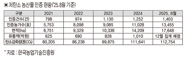 ½ÇÁ¦ ¼º°úµµ ¶Ñ·ÇÇÏ´Ù. ÀÎÁõ ³ó°¡ ¼ö´Â 2021³â 5,753È£¿¡¼ 2025³â 8¿ù ±âÁØ 13,455È£·Î 133.8% Áõ°¡Çß°í, ÀÎÁõ ¸éÀûµµ 6,751ha¿¡¼ 17,648ha·Î È®´ëµÇ¾ú´Ù. À¯Åë¾×Àº 2024³â¿¡¸¸ 1,010¾ï ¿øÀ» ±â·ÏÇßÀ¸¸ç, ¿¬°£ ź¼Ò °¨Ãà·®ÀÌ 11¸¸ ÅæÀ» ³Ñ¾î ½Â¿ëÂ÷ 5¸¸ ´ëÀÇ ¿¬°£ ¹èÃâ·®À» ÁÙÀÌ´Â È¿°ú¸¦ °ÅµÎ´Â µî ´ëÇ¥ÀûÀÎ ¼º°ø Á¤Ã¥À¸·Î Æò°¡¹Þ°í ÀÖ´Ù. Àúź¼Ò ÀÎÁõÀÌ ³ó°¡ ¼Òµæ ¾ÈÁ¤, ±¹°¡ ź¼Ò°¨Ãà, ¼ÒºñÀÚ Âü¿© È®´ë¶ó´Â ¡®3Áß È¿°ú¡¯¸¦ º¸¿©ÁÖ°í ÀÖ´Â °ÍÀÌ´Ù.