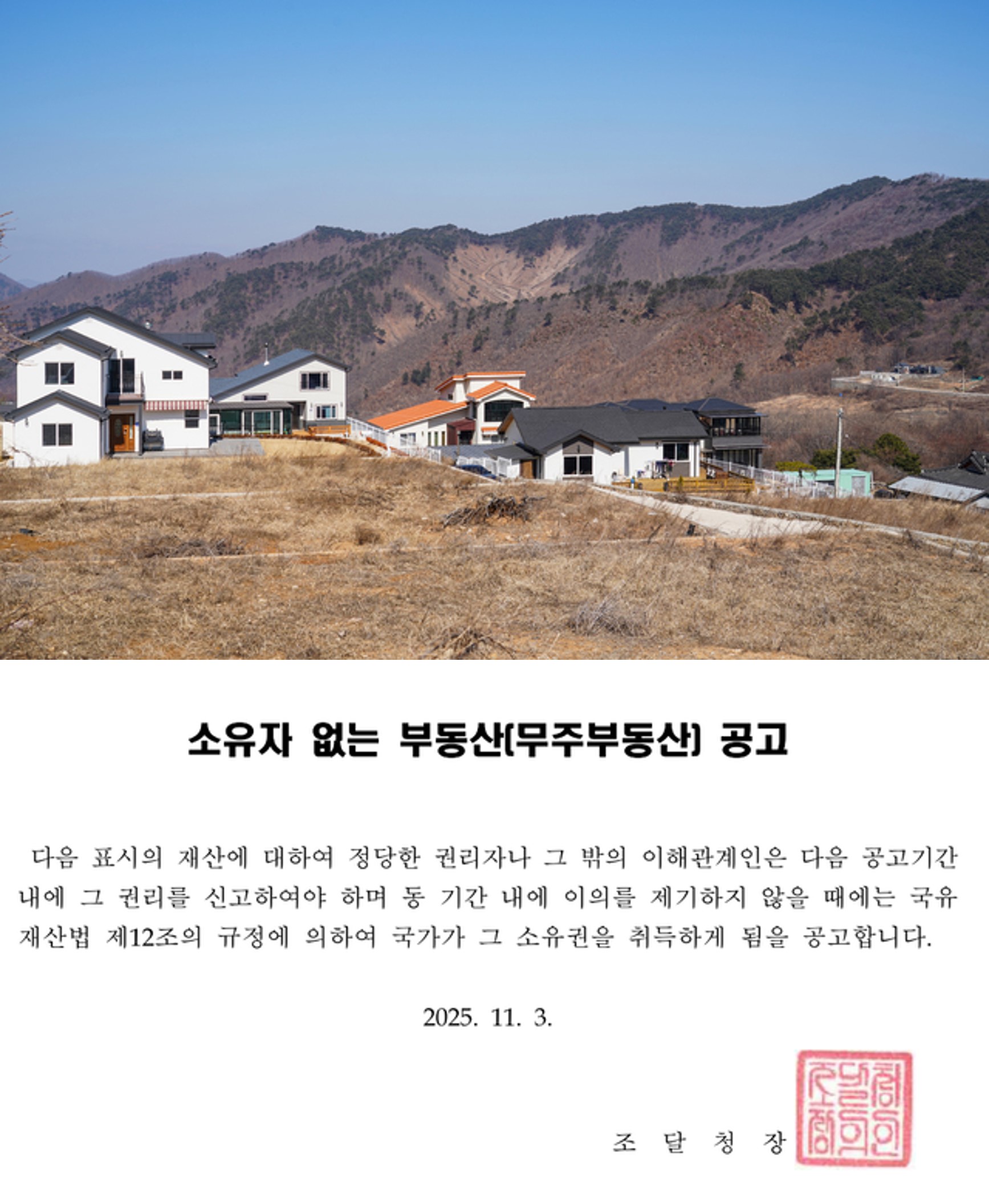 Á¶´ÞûÀº 3ÀÏ Àü±¹¿¡ ÀÖ´Â ¼ÒÀ¯ÀÚ ¾ø´Â ºÎµ¿»ê(¹«Áֺε¿»ê) 357ÇÊÁö(222¸¸3632§³)¸¦ ±¹À¯ÈÇϱâ À§ÇØ 11¿ù3ÀϺÎÅÍ 2026³â 5¿ù2ÀϱîÁö 6°³¿ù°£ °ø°í¸¦ ÁøÇàÇÑ´Ù°í ¹àÇû´Ù.