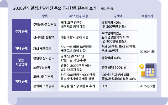 °íÇâ»ç¶û±âºÎÀÇ ¼¼¾×°øÁ¦ ÇýÅÃÀº È®´ëµÆ´Ù. ¿¬°£ ±âºÎÇѵµ°¡ 500¸¸¿ø¿¡¼ 2000¸¸¿øÀ¸·Î »óÇâµÆ°í, 10¸¸¿ø ±âºÎ ½Ã 100% ¼¼¾×°øÁ¦¿Í ÇÔ²² ±âºÎ±ÝÀÇ 30% »ó´ç ´ä·ÊǰÀ» ¹ÞÀ» ¼ö ÀÖ´Ù. 10¸¸¿ø ÃʰúºÐÀº ÀϹÝÁö¿ª 15%, Ưº°Àç³Áö¿ª 30%ÀÇ ¼¼¾×°øÁ¦°¡ Àû¿ëµÈ´Ù. ´Ü, Ưº°Àç³Áö¿ª °øÁ¦´Â ¼±Æ÷ÀϷκÎÅÍ 3°³¿ù µ¿¾È¸¸ À¯È¿ÇÏ´Ù. ¿ÃÇØ 12¿ù31ÀϱîÁö ±âºÎÇØ¾ß 2026³â ¿¬¸»Á¤»ê¿¡ ¹Ý¿µµÈ´Ù.