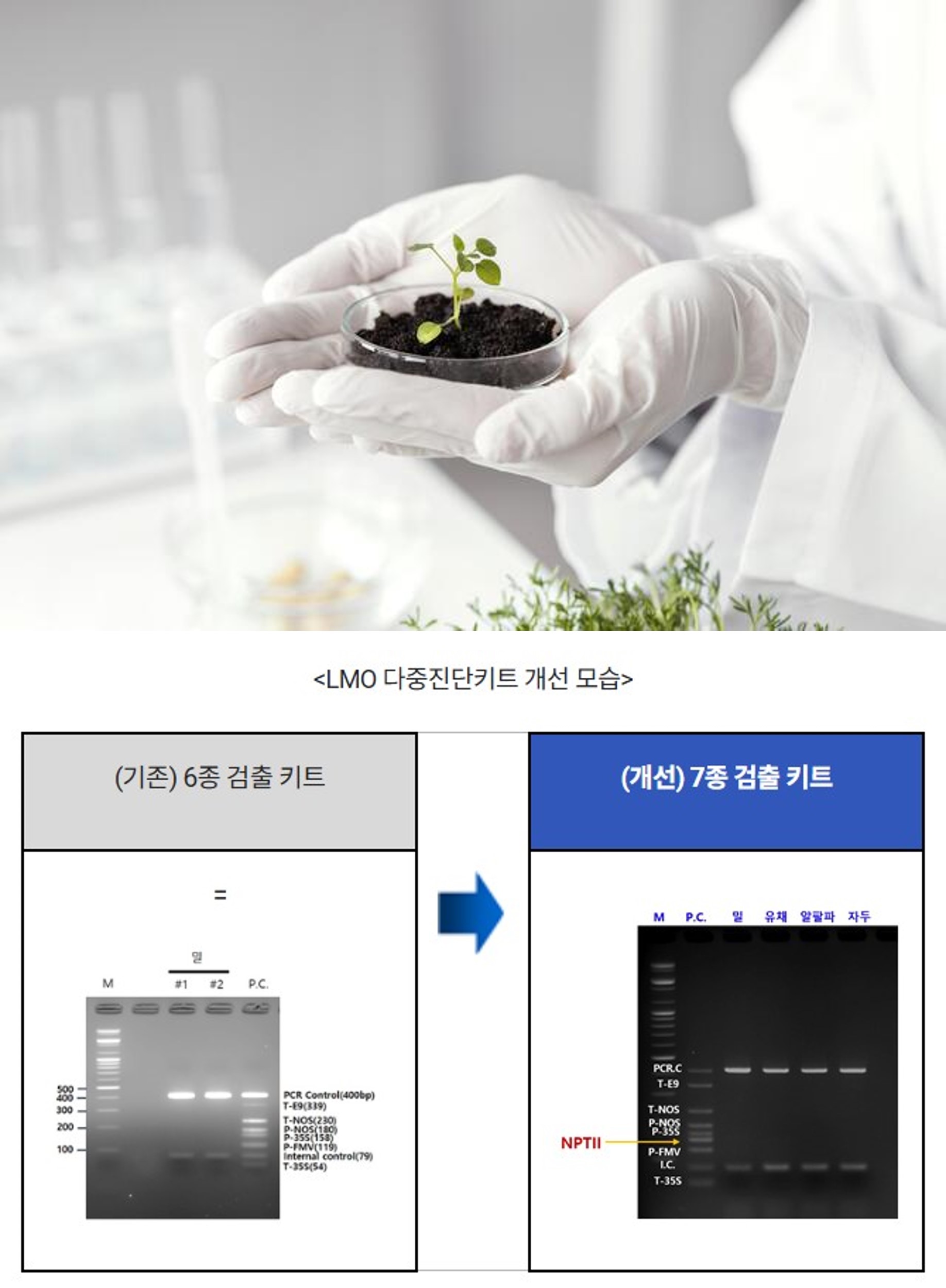 »õ·Î °³¹ßµÈ LMO °Ë»ç¹æ¹ýÀº ´ë»óÀÛ¹°À» ±âÁ¸ 5°³¿¡¼ µ¿ºÎ¡¤¹Ð¡¤»ç°ú¡¤Å丶Å䡤¸á·Ð µîÀ» Æ÷ÇÔÇÑ 21°³·Î È®´ëÇß´Ù. °ËÃâÀ¯ÀüÀÚµµ NPT¥±(Neomycin Phospho transferase ¥±¡¤À¯ÀüÀÚº¯Çü ¼±¹ß ¸¶Ä¿)¸¦ Ãß°¡ÇØ ÃÑ 7°¡Áö¸¦ µ¿½Ã¿¡ °ËÃâÇÒ ¼ö ÀÖ´Ù. °³º°ÀûÀ¸·Î °¨»çÇÒ °æ¿ì¿Í ºñ±³ÇÏ¸é ¼Ò¿ä½Ã°£°ú ºñ¿ëÀÌ 7ºÐÀÇ 1 ¼öÁØÀ¸·Î Àý°¨µÈ´Ù. ÀÌ¿¡ µû¶ó Áö±Ý±îÁö 1¸¸Á¡À» °Ë»çÇϴµ¥ 2¾ï8000¸¸¿ø°¡·®ÀÌ µé¾ú´Âµ¥, ¾ÕÀ¸·Î´Â 4000¸¸¿øÀÌ¸é µÈ´Ù.