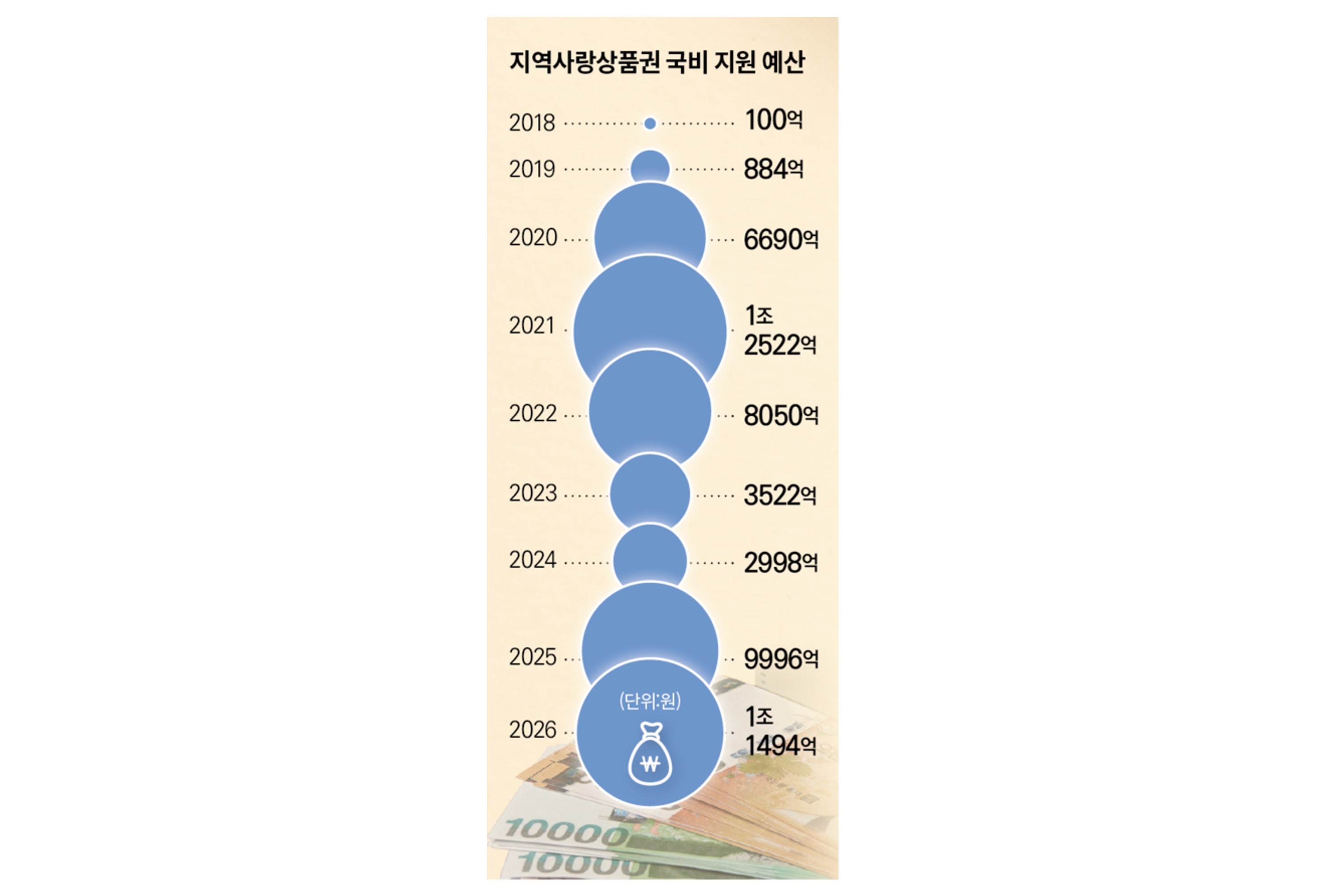 º¸°í¼¿¡ µû¸£¸é Áö¿ª»ç¶û»óǰ±Ç ±¹ºñ Áö¿øÀº 2019³â 884¾ï¿ø, 2020³â 6689¾ï¿ø, 2021³â 1Á¶2522¾ï¿øÀ¸·Î ±ÞÁõÇß´Ù. ±×·¯³ª À±¼®¿ Á¤ºÎ µé¾î 2022³â 8050¾ï¿ø, 2023³â 3522¾ï¿ø, 2024³â 2998¾ï¿øÀ¸·Î ÁÙ¾ú°í, Áö³ÇØ Æí¼ºÇÑ ¿ÃÇØ º»¿¹»ê¿¡´Â ±¹ºñ°¡ ÇÑ Ç¬µµ ¹Ý¿µµÇÁö ¾Ê¾Ò´Ù. ¹Ý¸é ÀÌÀç¸í Á¤ºÎ´Â ¿ÃÇØ Ãß°¡°æÁ¤¿¹»ê¿¡¼ ±¹ºñ 9996¾ï¿øÀ» ¹Ý¿µÇØ »ç¾÷À» »ç½Ç»ó º¹¿øÇß°í, ³»³âµµ Á¤ºÎ ¿¹»ê¾È¿¡¼µµ 1Á¶ 1494¾ï¿ø±îÁö È®´ëÇÒ °èȹÀÌ´Ù.