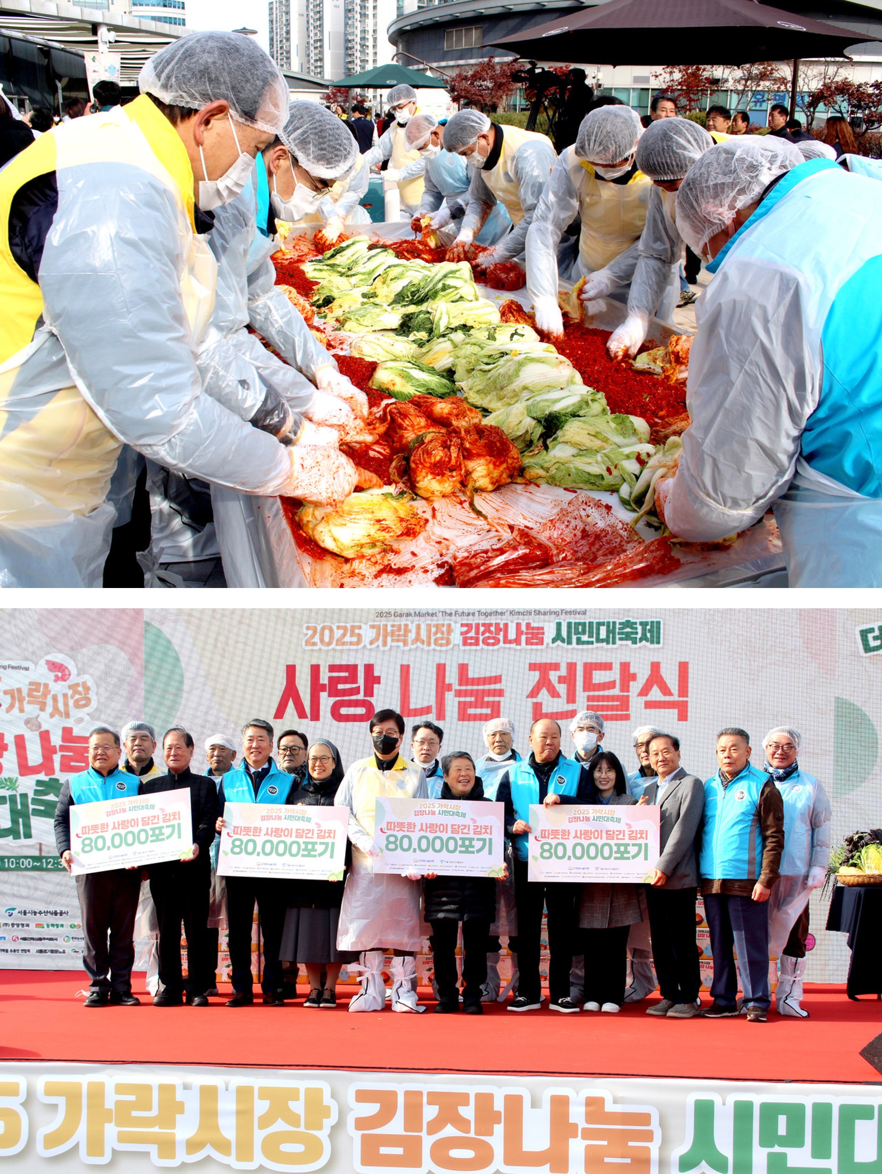 ÀÌ»ó¿ë Èñ¸Á³ª´®¸¶ÄÏ ÀÌ»çÀåÀº ¡°2008³âºÎÅÍ °¡¶ô½ÃÀåÀÇ À¯ÅëÀεéÀÌ ¿ÂÁ¤À» ´ã¾Æ¼ ¸Å³â 100ÅæÀÇ ±èÀå±èÄ¡¸¦ ¼Ò¿ÜµÈ ÀÌ¿ôµé°ú ³ª´©´Â ÀüÅëÀ» À̾°í ÀÖ´Ù¡±¸é¼ ¡°±èÀå Çà»ç´Â ¼Ò¿ÜµÈ ÀÌ¿ôµéÀ» µ½´Â °ÍÀº ¹°·Ð, ¿ì¸® ½º½º·Î¿¡°Ôµµ °¨»ç¿Í Ãæ¸¸ÇÔÀ» ÁÖ´Â ¼±¹° °°Àº ÇϷ硱¶ó°í °Á¶Çß´Ù. ¶Ç, ¹®¿µÇ¥ ¼¿ï½Ã³ó¼ö»ê½Äǰ°ø»ç »çÀåÀº ¡°°¡¶ô½ÃÀå°ú ³ó¼ö»ê½Äǰ À¯Åëȯ°æÀº °è¼Ó ¹Ù²î¾î¿ÔÁö¸¸ ¾î·Á¿î ÀÌ¿ô¿¡ ÀÛÀº ÈûÀÌ¶óµµ º¸ÅÂ°í ½Í´Ù´Â ¿ì¸®ÀÇ ¸¶À½Àº ´Ã °°Àº ÀÚ¸®¿¡ ÀÖ¾ú´Ù¡±¸é¼ ¡°°¡¶ô½ÃÀåÀ» ÅÍÀüÀ¸·Î ÇÏ´Â À¯ÅëÀεé°ú °ø»ç´Â ¿À´Ã°ú °°Àº ³ª´®ÀÇ ÀüÅëÀ» ¿À·¡ À̾ °ÍÀ» ¾à¼ÓÇÑ´Ù¡±°í °Á¶Çß´Ù.