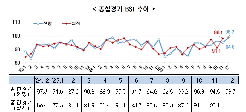 Çѱ¹°æÁ¦ÀÎÇùȸ(ÇѰæÇù)´Â ¸ÅÃâ¾× ±âÁØ 600´ë ±â¾÷À» ´ë»óÀ¸·Î Á¶»çÇÑ 12¿ù ±â¾÷°æ±â½Ç»çÁö¼ö(BSI) Àü¸ÁÄ¡°¡ 98.7·Î Áý°èµÆ´Ù°í 28ÀÏ ¹àÇû´Ù.