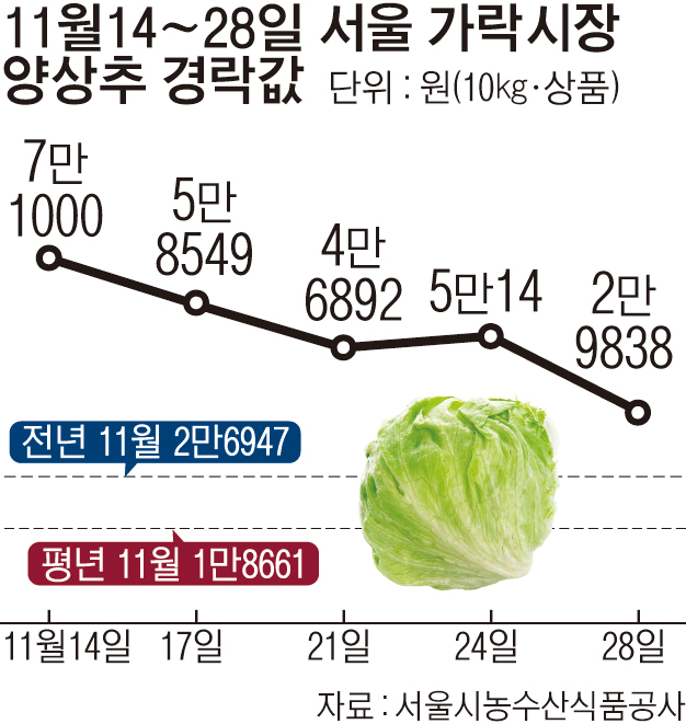 ½ÇÁ¦·Î 11¿ù ÇÑ´Þ°£ ¾ç»óÃß °æ¶ô°ªÀº 10§¸ »óǰ ÇÑ»óÀÚ´ç 2¸¸9000¿ø´ë¿¡¼ 7¸¸4000¿ø´ë·Î °í°øÇàÁøÇÏ´Â ¾ç»óÀ» º¸¿´´Ù. 11¿ù3ÀÏ 5¸¸3804¿øÀÌ´ø °æ¶ô°ªÀº 11¿ù8ÀÏ 7¸¸4961¿øÀ¸·Î ²±Ãæ ¶Ú ÀÌÈÄ 11¿ù15ÀÏ 6¸¸5034¿ø, 11¿ù20ÀÏ 5¸¸2334¿ø, 11¿ù25ÀÏ 4¸¸2020¿ø, 11¿ù28ÀÏ 2¸¸9838¿øÀ¸·Î Á¡Â÷ ³»·È´Ù. À̰°Àº ½Ã¼¼´Â 11¿ù28ÀÏ ±âÁØ Áö³ÇØ 11¿ù Æò±Õ(2¸¸6947¿ø)º¸´Ù 10.7%, Æò³â 11¿ù(1¸¸8661¿ø)º¸´Ù 59.9% ³ô´Ù.