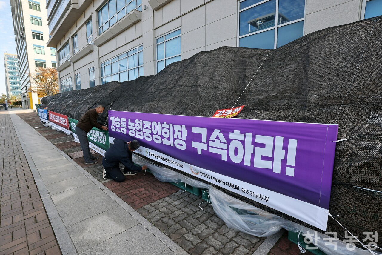 * Áö³´Þ 14ÀÏ Àü³² ¹«¾È±º ³óÇùÁß¾Óȸ Àü³²º»ºÎ ¾Õ¿¡¼ ¡®³ª¶ô°ª 8¸¸¿ø º¸Àå ±¤ÁÖÀü³² ³ó¹Î´ëȸ¡¯°¡ ¿¸° °¡¿îµ¥ ³ó¹ÎµéÀÌ Áö¿ª °÷°÷¿¡¼ °¡Á®¿Â ³ª¶ôÀ» ³óÇù ¾Õ¿¡ ½×Àº µÚ °È£µ¿ ȸÀåÀÇ ±¸¼ÓÀ» Ã˱¸ÇÏ´Â Çö¼ö¸·À» ¸Å´Þ°í ÀÖ´Ù. ÇѽÂÈ£ ±âÀÚ