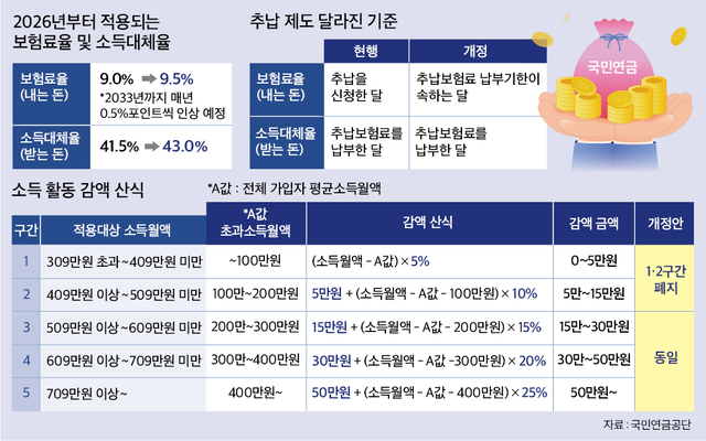 ¡ßÃß³³ ÇüÆò¼º ³í¶õ ÇØ¼Ò=±¹¹Î¿¬±ÝÀº 2026³âºÎÅÍ ¸ð¼ö°³Çõ¿¡ µé¾î°£´Ù. º¸Çè·áÀ²ÀÌ ÇöÇà 9%¿¡¼ 2026³âºÎÅÍ ¸Å³â 0.5%Æ÷ÀÎÆ®¾¿ ¿Ã¶ó 2030³â¿¡´Â 13%±îÁö ¿À¸£°í, ¼Òµæ´ëüÀ²Àº 41.5%¿¡¼ 43%·Î »óÇâµÈ´Ù. ÀÌ °úÁ¤¿¡¼ ¡®¿ÃÇØ 12¿ù¿¡ Ãß³³À» ½ÅûÇÏ¸é ³·Àº º¸Çè·áÀ²(9%)·Î ³³ºÎÇϸ鼵µ ´õ ³ôÀº ¼Òµæ´ëüÀ²(43%)À» Àû¿ë¹ÞÀ» ¼ö ÀÖ´Ù¡¯´Â ÇØ¼®ÀÌ ÆÛÁö¸ç Ãß³³ ¹®Àǰ¡ ±¹¹Î¿¬±Ý°ø´Ü Áö»ç¿Í °í°´¼¾ÅÍ¿¡ ÆøÁÖÇϰí ÀÖ´Ù.