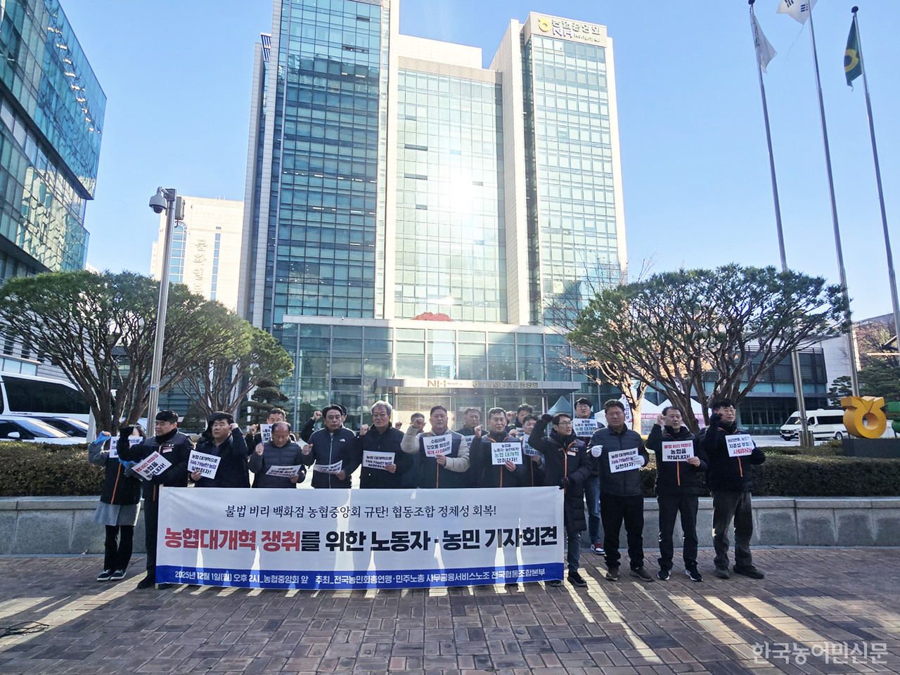 Àü±¹³ó¹ÎȸÃÑ¿¬¸Í°ú ¹ÎÁÖ³ëÃÑ »ç¹«±ÝÀ¶¼ºñ½º³ëÁ¶ Àü±¹Çùµ¿Á¶ÇÕº»ºÎ°¡ 1ÀÏ ¼¿ï Áß±¸ ³óÇùÁß¾Óȸ º»»ç ¾Õ¿¡¼ ±âÀÚȸ°ßÀ» ¿°í ³óÇù °³Çõ°ú Á¤ºÎÀÇ °¨µ¶ °È¸¦ Ã˱¸Çß´Ù.