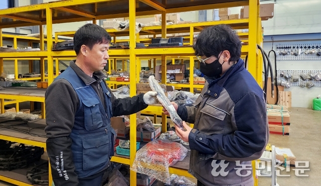 * °æ±â ¾çÆò ¿ë¹®³óÇù ³ó±â°è¼¾ÅÍ¿¡¼ ¼ÛºÀÂù ¼¾ÅÍÀå(¿ÞÂÊ)°ú ÀÌÁ¤½Ä °èÀåÀÌ ³ó±â°è ¼ö¸®¿¡ »ç¿ëÇÒ ºÎǰÀ» »ìÆìº¸°í ÀÖ´Ù