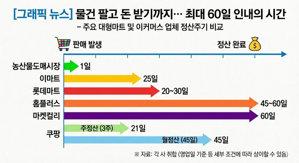 À§ ±×·¡ÇÈÀº À¯ÅëÀÇ ºÒÆíÇÑ Áø½ÇÀ» Àû³ª¶óÇÏ°Ô º¸¿©ÁØ´Ù. ³ó¹ÎÀÌ ÇǶ¡ Èê·Á Ű¿î ³ó»ê¹°À» ³Ñ°åÀ» ¶§, µµ¸Å½ÃÀåÀº ÀÌÆ±³¯À̸é ÅëÀå¿¡ Çö±ÝÀ» ²È¾ÆÁØ´Ù. ¹Ý¸é, ''»ó»ý''À» ¿ÜÄ¡´Â ´ëÇü¸¶Æ®¿Í °Å´ë ÀÌÄ¿¸Ó½º ¾÷üµéÀº ª°Ô´Â 20ÀÏ, ±æ°Ô´Â µÎ ´Þ(60ÀÏ) µÚ¿¡¾ß ´ë±ÝÀ» Á¤»êÇÑ´Ù.