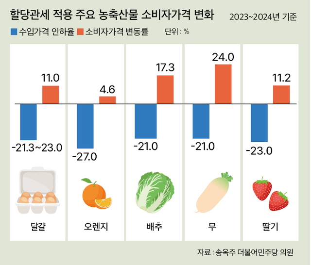 ¼Û¿ÁÁÖ ´õºÒ¾î¹ÎÁÖ´ç ÀÇ¿ø(°æ±â ȼº°©)ÀÌ 2022¡2024³â Áß 1³â ÀÌ»ó ÇÒ´ç°ü¼¼¸¦ Àû¿ëÇÑ 17°³ ³ó½ÄǰÀ» ´ë»óÀ¸·Î ºÐ¼®ÇÑ °á°ú ÇÒ´ç°ü¼¼¿¡ µû¸¥ ¼öÀÔ°¡°Ý Ç϶ôÀÌ ¼ÒºñÀÚ°¡°Ý Ç϶ô±îÁö À̾îÁø °æ¿ì´Â ¸¹Áö ¾Ê¾Ò´Ù. °¡·É ¹èÃß´Â ¡®±Ý(ÐÝ)¹èÃß ÆÄµ¿¡¯ÀÌ ÅÍÁø 2010³â¿¡ À̾î Áö³ÇØ ¾à 10³â ¸¸¿¡ ÇÒ´ç°ü¼¼°¡ Àû¿ëµÆ´Âµ¥ ¼öÀÔ°¡°ÝÀº 21% Ç϶ôÇÑ ¹Ý¸é ¼ÒºñÀÚ°¡°ÝÀº ¿ÀÈ÷·Á 17% ¿Ã¶ú´Ù. ´Þ°¿¡¤¿À·»Áö¡¤µþ±â¡¤ÆÄÀξÖÇ᤹ٳª³ª µî ¿©Å¸ ǰ¸ñµµ ¸¶Âù°¡Áö¿´´Ù.