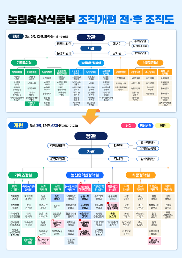 ¡®³ó¾÷Çõ½ÅÁ¤Ã¥½Ç¡¯ ¡®³ó¾÷Çõ½ÅÁ¤Ã¥°ü¡¯Àº º» ¾÷¹«°¡ ³ó¾÷ ÀüÈĹæ»ê¾÷ ºÐ¾ß¸¦ Æ÷°ýÇϰí ÀÖ´Â Á¡À» ¹Ý¿µÇØ ¡®³ó»ê¾÷Çõ½ÅÁ¤Ã¥½Ç¡¯ ¡®³ó»ê¾÷Çõ½ÅÁ¤Ã¥°ü¡¯À¸·Î ¸íĪÀ» ¹Ù²Û´Ù. ³ó½ÄǰºÎ ¼Ò¼Ó±â°üÀÎ ¡®³ó½Äǰ°ø¹«¿ø±³À°¿ø¡¯Àº ³ó½Äǰ ºÐ¾ß ÀÎÀç ¾ç¼º ±â°üÀÇ ¿ªÇÒÀ» °ø°íÈ÷ ÇÑ´Ù´Â Àǹ̷Π±× ¸íĪÀ» ¡®³ó½ÄǰÀÎÀç°³¹ß¿ø¡¯À¸·Î ¹Ù²Û´Ù.