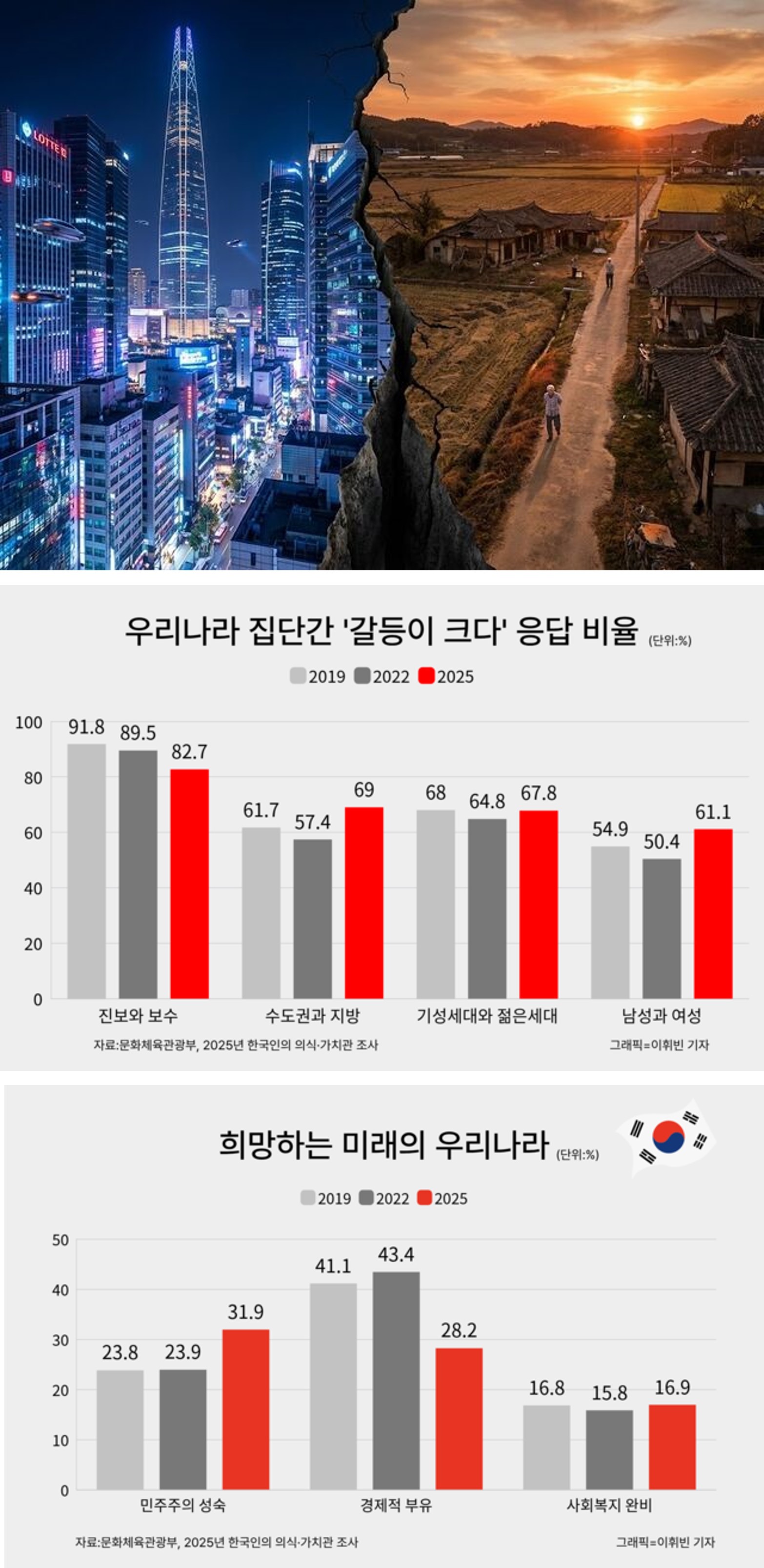 ¡ß¡®¼öµµ±Ç vs Áö¹æ¡¯ 3³â Àüº¸´Ù 11.6%Æ÷ÀÎÆ®¡è=°¡Àå ´«¿¡ ¶ç´Â ´ë¸ñÀº ½ÉÈÇÏ´Â »çȸ °¥µî ÁöÇ¥´Ù. ¿ì¸® »çȸ ÁÖ¿ä °¥µî ¿äÀÎÀ» ¹¯´Â Ç׸ñ¿¡¼ ¡®¼öµµ±Ç°ú Áö¹æÀÇ °¥µî¡¯ÀÌ ½É°¢ÇÏ´Ù´Â ÀÀ´äÀº 69.0%¸¦ ±â·ÏÇß´Ù. ÀÌ´Â 2022³â Á¶»ç(57.4%) ´ëºñ 11.6%Æ÷ÀÎÆ® ±ÞÁõÇÑ ¼öÄ¡´Ù. ¡®Áøº¸¿Í º¸¼ö¡¯ °¥µî(82.7%)ÀÌ ¿©ÀüÈ÷ 1À§¸¦ Â÷ÁöÇßÁö¸¸, »ó½Â Æø¸¸ ³õ°í º¸¸é ¼öµµ±Ç¡¤Áö¹æ °¥µîÀÌ Àü ¼¼´ë¿Í °èÃþÀ» ÅëÆ²¾î °¡Àå °¡ÆÄ¸£°Ô ¾ÇÈÇß´Ù.