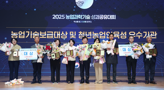 * 4ÀÏ ÀüºÏ ÀüÁÖ ³óÃÌÁøÈïû Á¾ÇÕ¿¬Âù°ü¿¡¼­ ¿­¸° ¡®2025 ³ó¾÷°úÇбâ¼ú ¼º°ú°øÀ¯´ëȸ¡¯¿¡¼­ ³ó¾÷±â¼úº¸±Þ´ë»ó ¼ö»óÀÚ µîÀÌ À̽µ· ³óÁøÃ»Àå(¿ÞÂÊ ´Ù¼¸¹øÂ°)°ú ÇÔ²² »óÆÐ¸¦ µé¾î º¸À̰í ÀÖ´Ù. ³óÃÌÁøÈïû