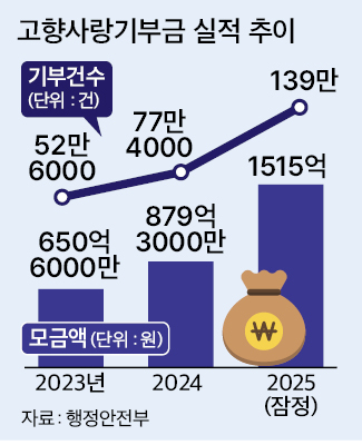 ÇàÁ¤¾ÈÀüºÎ¿¡ µû¸£¸é 2025³â ÇÑÇØ µ¿¾È ¸ðÀÎ °íÇâ±âºÎ±ÝÀº 1515¾ï¿øÀ¸·Î ÀáÁ¤ Áý°èµÆ´Ù. Á¦µµ ½ÃÇà Ã¹ÇØÀÎ 2023³â ¸ð±Ý¾× ¾à 651¾ï¿ø°ú °ßÁà 130%, 2024³âÀÇ 879¾ï¿øº¸´Ù 70% Áõ°¡ÇÑ ¼öÄ¡´Ù. ±âºÎ°Ç¼ö´Â 139¸¸°ÇÀ¸·Î, Àü³â(77¸¸°Ç) ´ëºñ 80% ´Ã¾ú´Ù. Áö¿ª ³óƯ»êǰ, °ü±¤¡¤¼÷¹Ú »óǰ µî ´ä·Êǰ ÆÇ¸Å¾×µµ 1³â Àü(205¾ï¿ø)º¸´Ù 54% Áõ°¡ÇÑ 316¾ï¿øÀ¸·Î Á¶»çµÆ´Ù.