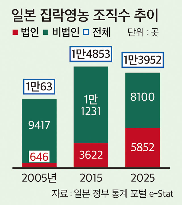 ÀϺ» ³ó¸²¼ö»ê¼ºÀÌ ³»³õÀº ¡®2025³â Áý¶ô¿µ³ó(°øµ¿¿µ³ó) ½ÇÅÂÁ¶»ç¡¯¿¡ µû¸£¸é 2025³â 2¿ù ±âÁØ Àü±¹ÀÇ Áý¶ô¿µ³ó Á¶Á÷Àº 1¸¸3952°÷¿¡ ´ÞÇÑ´Ù. ÀÌ °¡¿îµ¥ ¹ýÀÎ ÇüÅ·Π¿î¿µµÇ´Â Á¶Á÷Àº 41.9%(5852°÷)´Ù. Àü³â°ú ºñ±³Çϸé Áý¶ô¿µ³ó Àüü ¼ö´Â 53°÷ ÁÙ¾úÁö¸¸, ¹ýÀÎÇü Á¶Á÷Àº 102°÷ ´Ã¾ú´Ù. Áý¶ô¿µ³óÀÌ ´Ü¼øÇÑ °øµ¿ ÀÛ¾÷´Ü°è¸¦ Áö³ª, µ¶¸³ÀûÀÎ °æ¿µ ÁÖü·Î ÀüȯµÇ°í ÀÖÀ½À» º¸¿©ÁÖ´Â ´ë¸ñÀÌ´Ù.