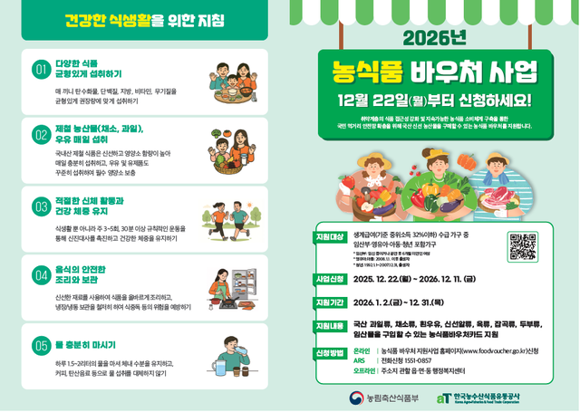 ³ó½Äǰ¹Ù¿ìó´Â »ý°è±Þ¿© ¼ö±Þ °¡±¸ °¡¿îµ¥ ÀÓ»êºÎ¡¤¿µÀ¯¾Æ¡¤¾Æµ¿¡¤Ã»³âÀÌ Æ÷ÇԵȠ°¡±¸¸¦ ´ë»óÀ¸·Î ±¹»ê ³ó½ÄǰÀ» ±¸¸ÅÇÒ ¼ö Àִ ¹Ù¿ì󸦠Áö±ÞÇϴ Á¦µµ´Ù. Ãë¾à°èÃþÀÌ ½Å¼±ÇÏ°í ¿µ¾ç°¡ Àִ ½ÄǰÀ» ¾ÈÁ¤ÀûÀ¸·Î ¼·ÃëÇÒ ¼ö ÀÖµµ·Ï µµ¿Í °Ç°­ÇÑ ½Ä»ýȰÀ» ¿µÀ§ÇÒ ¼ö ÀÖµµ·Ï Çϴ °ÍÀÌ ¸ñÀûÀÌ´Ù. ´ë»óÀڴ ¿ÃÇØ 12¿ù11ÀϱîÁö ¡®³ó½Äǰ¹Ù¿ìó Áö¿ø»ç¾÷¡¯ ´©¸®Áý ¶Ç´Â ÀÚµ¿ÀÀ´äÀüÈ­(ARS)·Î ½ÅûÇϰųª °üÇÒ À¾¡¤¸é¡¤µ¿ ÇàÁ¤º¹Áö¼¾ÅÍ¿¡ ¹æ¹® ½ÅûÇϸ頵ȴÙ.
