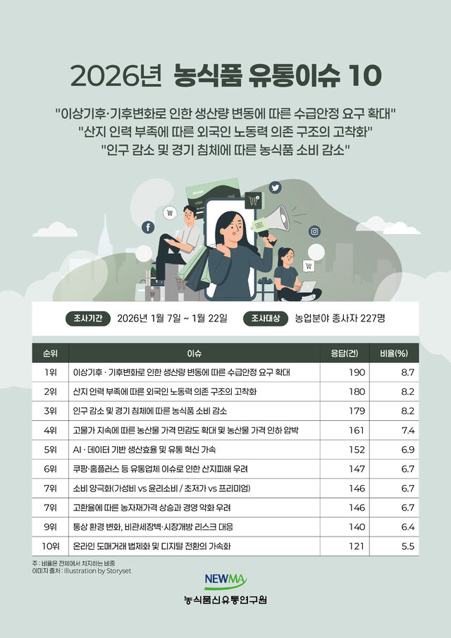 ³ó½Äǰ½ÅÀ¯Å뿬±¸¿ø(ÀÌ»çÀå ¿øÃ¶Èñ, ¿øÀå ±èµ¿È¯)Àº 27ÀÏ ¡®2026³â ³ó½Äǰ À¯ÅëÀ̽´ 10¡¯À» ³»³ù´Ù. À̸¦ À§ÇØ ¿¬±¸¿øÀº ³ó½Äǰ À¯Åë Àü¹®°¡¸¦ ´ë»óÀ¸·Î 7~22ÀÏ ¼³¹®Á¶»ç¸¦ ÁøÇàÇß´Ù. ¼³¹® ÀÀ´äÀÚ´Â ¸ðµÎ 227¸íÀÌ´Ù.