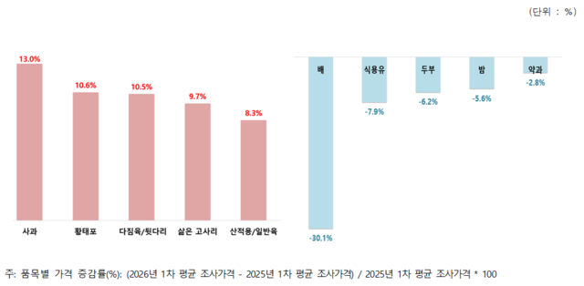 ÇùÀÇȸ¿¡ µû¸£¸é Á¦¼ö¿ëǰ 23°³ Áß Àü³â ´ëºñ °¡°ÝÀÌ ¿À¸¥ Ç°¸ñÀº 14°³´Ù. »ó½Â·ü »óÀ§ 5°³ Ç°¸ñÀº »ç°ú(13.0%), È²ÅÂÆ÷(10.6%), µÅÁö°í±â(´ÙÁüÀ°¡¤µÞ´Ù¸®, 10.5%), »îÀº °í»ç¸®(±¹»ê, 9.7%), ¼è°í±â(»êÀû¿ë¡¤ÀϹÝÀ°, 8.3%)´Ù.