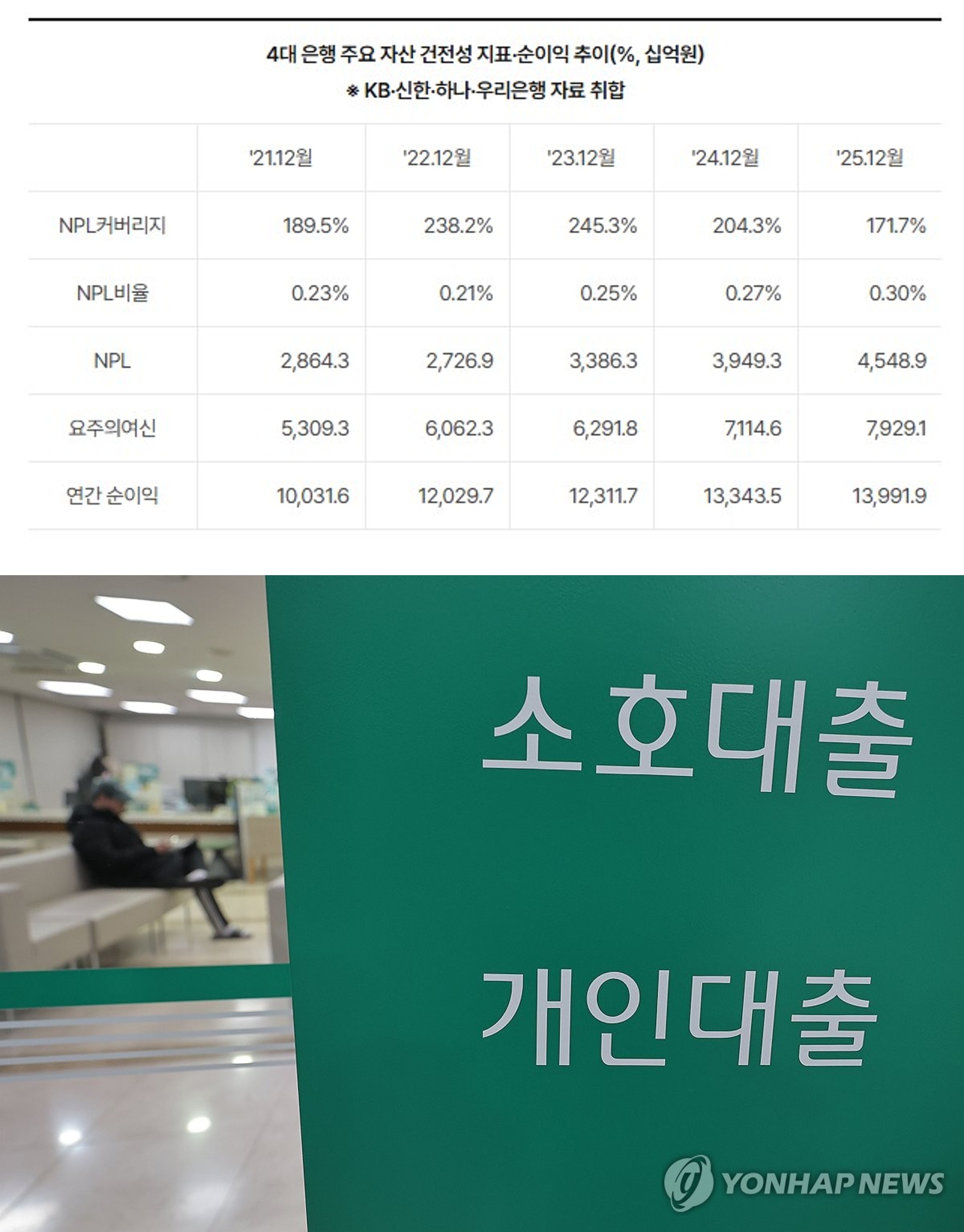 4´ë ÁÖ¿ä ½ÃÁßÀºÇà(KB¡¤½ÅÇÑ¡¤Çϳª¡¤¿ì¸®)ÀÌ Áö³­ÇØ ¾à 14Á¶¿ø¿¡ À̸£´Â »ç»ó ÃÖ´ë ¼øÀÌÀÍÀ» °Åµ×Áö¸¸, µ¿½Ã¿¡ ºÎ½Ç ´ëÃâµµ ´«µ¢ÀÌó·³ ºÒ¾î³ª¸é¼­ °ü·Ã °ÇÀü¼º ÁöÇ¥°¡ °è¼Ó ³ªºüÁö°í ÀÖ´Ù.