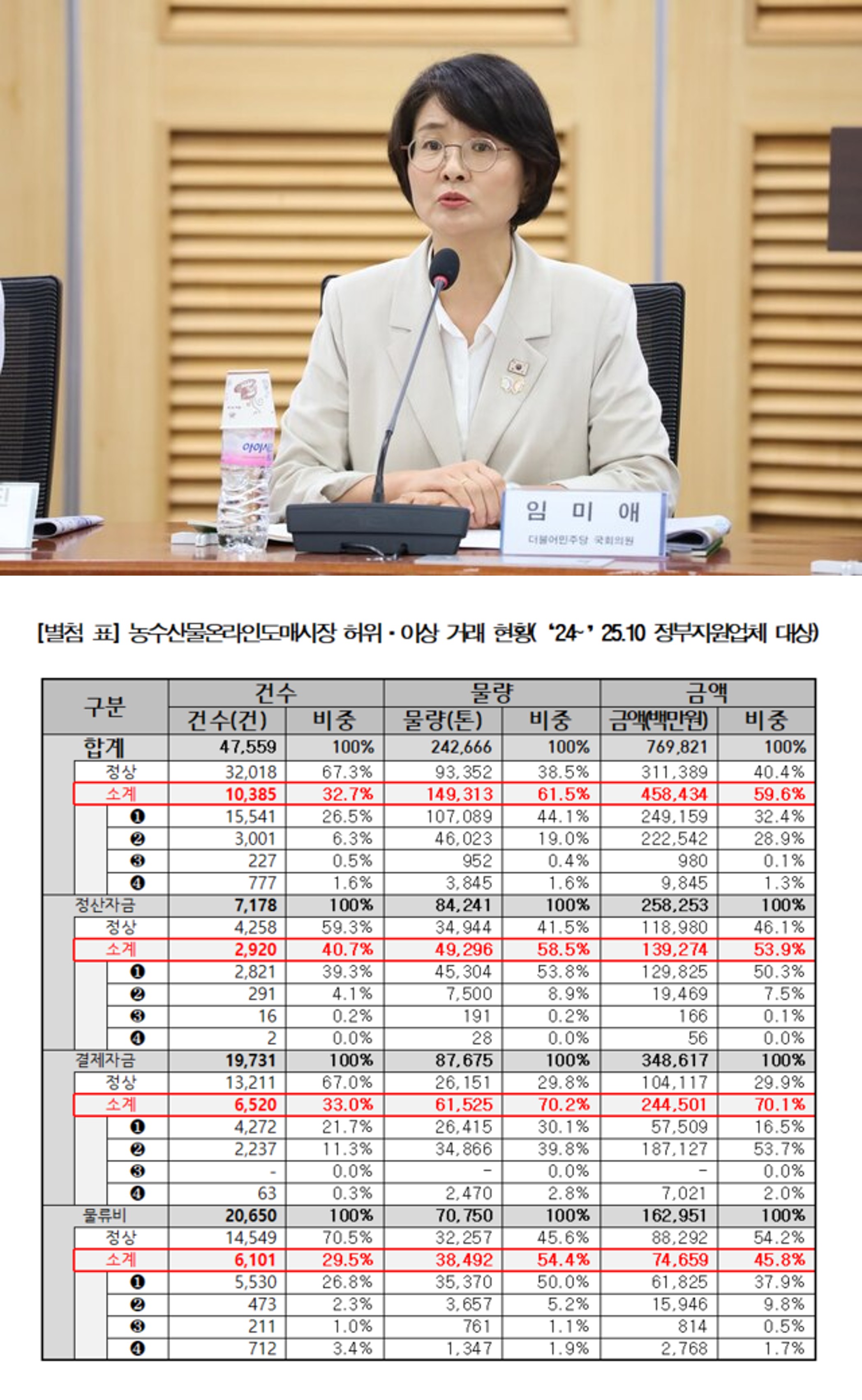 ³ó¸²Ãà»ê½ÄǰºÎ°¡ ½Ç½ÃÇÑ ¡®Á¤Ã¥Áö¿øÀ» ¹ÞÀº ¾÷üº° ³ó¼ö»ê¹° ¿Â¶óÀεµ¸Å½ÃÀå °Å·¡ ½ÇÅ Àü¼öÁ¶»ç(2024³â ~2025³â 10¿ù)¡¯¿¡ µû¸£¸é, Á¶»ç ´ë»ó °Å·¡ ±Ô¸ð 7698¾ï¿ø Áß 4584¾ï¿ø(59.6%)ÀÌ Æ¯¼ö°ü°èÀÎ °Å·¡, »çÈĵî·Ï, ±Ù°Å¸® À̵¿ µî ¡®ÇãÀ§¡¤ÀÌ»ó°Å·¡¡¯ À¯ÇüÀ¸·Î ºÐ·ùµÆ´Ù. ¹°·®À» ±âÁØÀ¸·Î´Â ÀüüÀÇ 61.5%¿¡ ´ÞÇÑ´Ù.