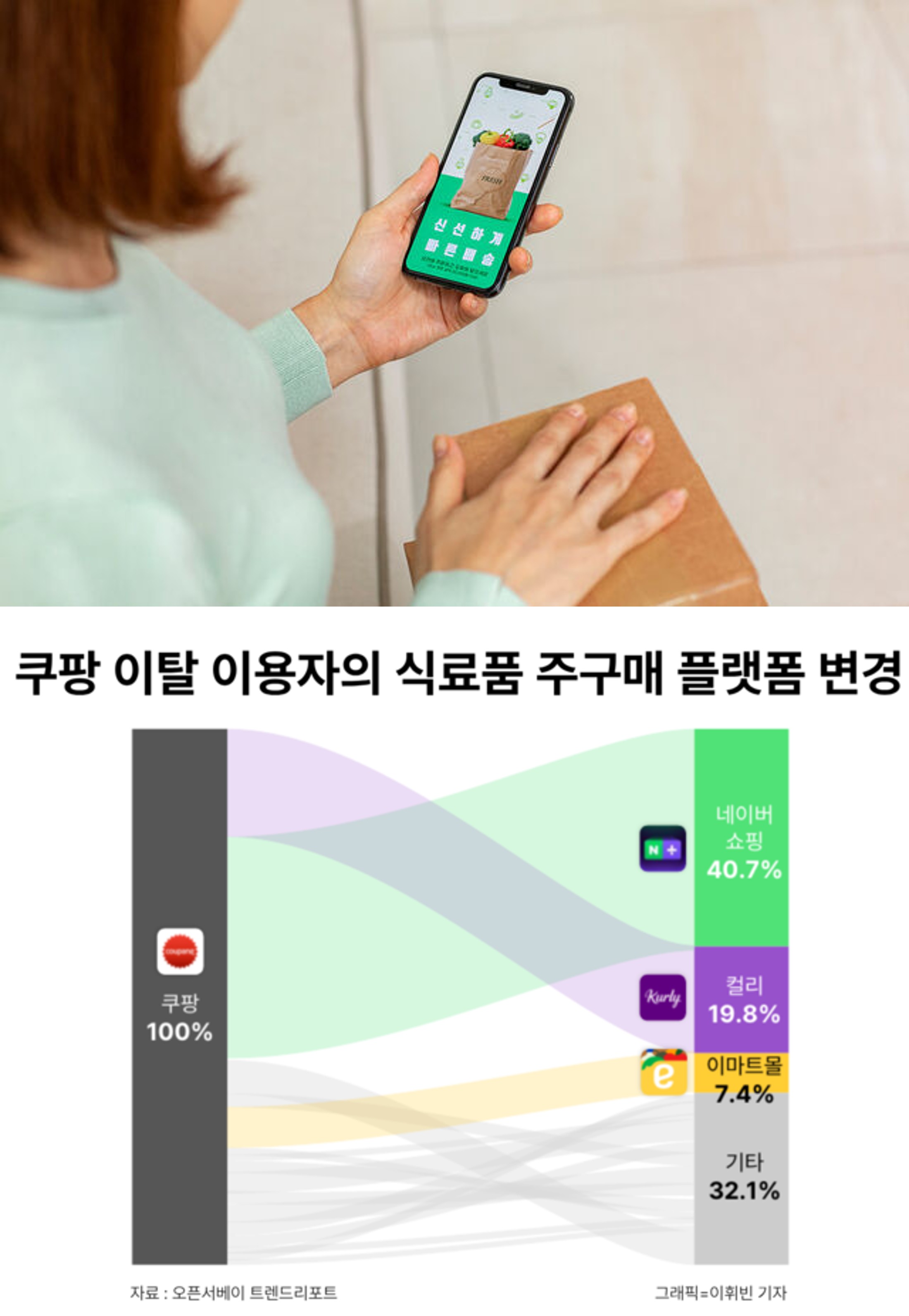¡ß Èçµé¸®´Â ¡®ÄíÆÎ õÇÏ¡¯¡¦ÀÌÅ»ÀÚ ³×À̹ö¡¤Äø®·Î=ÄíÆÎÀº ¿©ÀüÈ÷ ¿Â¶óÀÎ ½Ä·áǰ Ç÷§Æû ÀÔÁö¸¦ ÁöÄ×Áö¸¸ ÀÌ¿ë·üÀº 10.7%Æ÷ÀÎÆ® °¨¼ÒÇß´Ù. ÄíÆÎÀ» ¶°³ ¼ÒºñÀÚ´Â ¿Â¡¤¿ÀÇÁ¶óÀο¡¼ Àß ¾Ë·ÁÁø ´ëÇü Ç÷§ÆûÀ¸·Î À̵¿Çß´Ù. ÄíÆÎÀ» ÁÖ ±¸¸Å ä³Î·Î ÀÌ¿ëÇÏ´Ù°¡ ´Ù¸¥ °÷À¸·Î ¿Å±ä ¼ÒºñÀÚÀÇ 40.7%´Â ³×À̹ö¼îÇÎÀ» ¼±ÅÃÇß´Ù. Äø®·Î À̵¿ÇÑ ºñÀ²Àº 19.8%¿´´Ù.