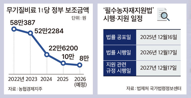 ¹ýÁ¦Ã³ ±¹°¡¹ý·ÉÁ¤º¸¼¾ÅÍ¿¡ µû¸£¸é ¡®Çʼö³óÀÚÀçÁö¿ø¹ý¡¯Àº 2025³â 12¿ù16ÀÏ Á¦Á¤¡¤°øÆ÷µÆ´Ù. ÇÏÁö¸¸ ½ÃÇàÀÏÀº 1³â ÈÄÀÎ 2026³â 12¿ù17ÀÏ·Î ¸í½ÃµÅ ÀÖ´Ù. ÀÌ ¹ýÀÇ ÇÙ½ÉÀº Á¦7Á¶ ¡®Çʼö³óÀÚÀç µî Áö¿ø¡¯¿¡ °üÇÑ Á¶Ç×ÀÌ´Ù. Á¶Ç×Àº ¡®°ø±Þ¸Á À§ÇèÀ¸·Î ÀÎÇØ Çʼö³óÀÚÀç µîÀÇ °¡°ÝÀÌ ´ëÅë·É·ÉÀÌ Á¤ÇÏ´Â ¼öÁØ ÀÌ»óÀ¸·Î »ó½ÂÇÏ¸é ³ó¸²Ãà»ê½ÄǰºÎ Àå°üÀÌ Á¤ÇÏ´Â °¡°Ý ¹üÀ§¿¡¼ ³ó¾÷°æ¿µÃ¼¿¡ °¡°Ý »ó½ÂºÐÀÇ ÀüºÎ ¶Ç´Â ÀϺθ¦ Áö¿øÇÒ ¼ö ÀÖ´Ù¡¯°í Á¦½ÃµÆ´Ù. ÇÏÁö¸¸ ¹ýÀÇ ºÎÄ¢Àº ¡®Á¦7Á¶ºÎÅÍ 9Á¶±îÁö µîÀÇ ±ÔÁ¤Àº °øÆ÷ ÈÄ 2³âÀÌ °æ°úÇÑ ³¯ºÎÅÍ ½ÃÇàÇÑ´Ù¡¯°í ¸í½ÃÇß´Ù.