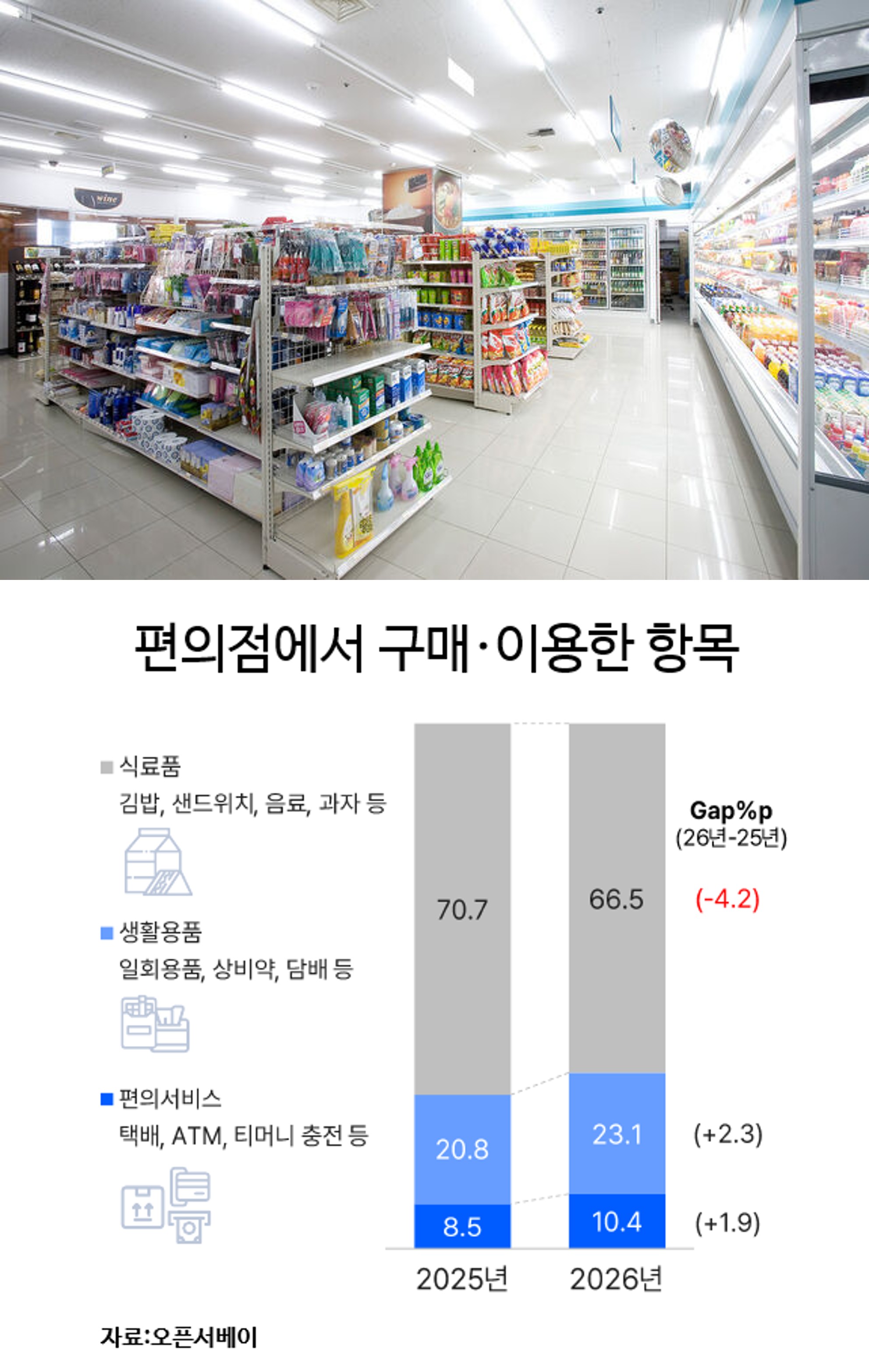 ±¸¸Å Ç׸ñ ºñÁßµµ º¯Çϰí ÀÖ´Ù. ½Ä·áǰ ±¸¸Å ºñÁßÀÌ ¿©ÀüÈ÷ ³ôÁö¸¸(2025³â 70.7%¡æ2026³â 66.5%), Àü ¿¬·É´ë¿¡¼ »ýȰ¿ëǰ(¡¨20.8¡æ¡¨23.1%)°ú ÆíÀǼºñ½º ÀÌ¿ë(¡¨8.5%¡æ¡¨10.4%)ÀÌ Àü³âº¸´Ù Á¶±Ý¾¿ Áõ°¡Çß´Ù. »óºñ¾àÀ» ºñ·ÔÇÑ Çʼö »ýȰ¿ëǰ ±¸¸ÅºÎÅÍ ÅÃ¹è ¹ß¼Û, ±³ÅëÄ«µå ÃæÀü, ±ÝÀ¶ ¾÷¹« µîÀ» ÇÑ °ø°£¿¡¼ ÇØ°áÇÏ´Â ¸ð½ÀÀÌ´Ù.