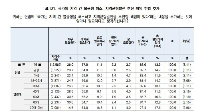 ÀÚÄ¡ºÐ±Ç ¹× ±ÕÇü¹ßÀü°ú °ü·ÃÇØ ±¹°¡°¡ Áö¿ª °£ ºÒ±ÕÇü ÇØ¼Ò¿Í Áö¿ª ±ÕÇü¹ßÀüÀ» ÃßÁøÇÒ Ã¥ÀÓÀ» Çå¹ý¿¡ ¸í½ÃÇÏ´Â ¹æ¾È¿¡´Â 83.0%°¡ ¡®ÇÊ¿äÇÏ´Ù¡¯°í ´äÇß´Ù(¸Å¿ì ÇÊ¿ä 26.0%, ´ëü·Î ÇÊ¿ä 57.0%). ¡®ÇÊ¿äÇÏÁö ¾Ê´Ù¡¯´Â ÀÀ´äÀº 13.3%, ¡®Àß ¸ð¸£°Ú´Ù¡¯´Â ÀÀ´äÀº 3.7%¿´´Ù.