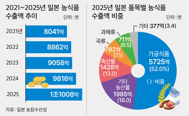 ÀϺ» ³ó¸²¼ö»ê¼ºÀÌ ÃÖ±Ù ¹ßÇ¥ÇÑ ¡®2025³â ³ó¸²¼ö»ê¹°¡¤½ÄǰÀÇ ¼öÃâ ½ÇÀû¡¯¿¡ µû¸£¸é Áö³ÇØ ÀϺ»ÀÇ ³ó½Äǰ ¼öÃâ¾×(Àӻ깰¡¤¼ö»ê¹° Á¦¿Ü)Àº 1Á¶1008¾ï¿£(10Á¶2700¾ï¿ø)À̾ú´Ù. ÀϺ» ³ó½Äǰ ¼öÃâ¾×ÀÌ 1Á¶¿£À» ³Ñ¾î¼± °ÍÀº À̹øÀÌ Ã³À½ÀÌ´Ù.