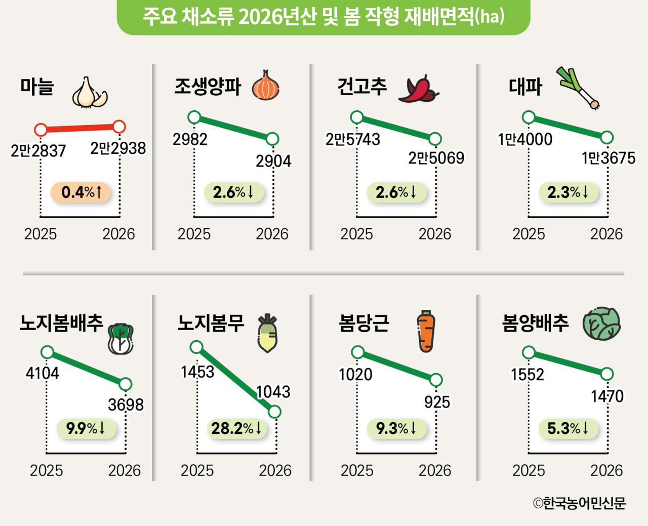 ¹èÃß¡¤¹« µî ¿±±Ùä¼Ò·ù´Â Áö³ÇØ º½¹èÃß¿Í º½¹« ÃâÇϱ⠽ü¼°¡ ³·¾Ò´ø Å¿¿¡ ÀÏÁ¦È÷ ¿ÃÇØ º½ ÀÛÇü Àç¹è¸éÀûÀÌ °¨¼ÒÇÒ °ÍÀ¸·Î ¿¹ÃøµÆ´Ù. º½¹èÃßÀÇ °æ¿ì Áö³ÇØ 5¿ù°ú 6¿ù Æò±Õ 5941¿ø°ú 7003¿øÀ» ±â·ÏÇß´ø ½Ã¼¼(10kg, »óǰ) ¾à¼¼¿Í 6¿ù ÀúÀå±â ÀæÀº °¿ì µî ±â»ó »óȲ¿¡ ´ëÇÑ ¿ì·Á°¡ Àç¹è¸éÀû °¨¼ÒÀÇ ¿øÀÎÀÌ µÆ´Ù. ¿ÃÇØ ½Ã¼³º½¹èÃß Àç¹è¸éÀûÀº Àü³â ´ëºñ 6.8% °¨¼ÒÇÑ 304ha, ³ëÁöº½¹èÃß´Â 2025³âº¸´Ù 9.9% ÁÙ¾îµç 3698ha°¡ µÉ °ÍÀ¸·Î ÆÄ¾ÇµÆ´Ù.