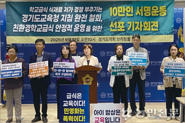 °æ±âµµÄ£È¯°æ³ó¾÷Àο¬ÇÕȸ µî 59°³ ´Üü·Î ±¸¼ºµÈ ¡®°æ±âµµ±³À°Ã» ½ÄÀç·á Àú°¡ °æÀïÀÔÂû Á¦µµ µµÀÔ ÀúÁö ½Ã¹Î»çȸ °øµ¿´ëÃ¥À§¿øÈ¸¡¯(°ø´ëÀ§)´Â 17ÀÏ °æ±âµµÀÇȸ¿¡¼ ±âÀÚȸ°ßÀ» ¿°í ¡®Çб³±Þ½Ä ½ÄÀç·á Àú°¡ °æÀï ÀÔÂû Áöħ ¿ÏÀü öȸ¿Í ģȯ°æ ½ÄÀç·á ¾ÈÁ¤ °ø±ÞÀ» À§ÇÑ 10¸¸ÀÎ ¼¸í¿îµ¿¡¯À» ¼±Æ÷Çß´Ù.
