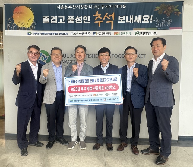 Çѱ¹³ó¼ö»ê¹°µµ¸Å½ÃÀå¹ýÀÎÇùȸ °¡¶ô½ÃÀåÁöȸ(ÁöȸÀå ÀÌ»ó¿ë¡¤´ë¾ÆÃ»°ú ´ëÇ¥)´Â Ãß¼® ¸íÀýÀ» ¸Â¾Æ 24ÀÏ ¼­¿ï °ø¿µµµ¸Å½ÃÀå ÇöÀå Á¾»çÀÚÀÇ ³ë°í¿¡ °¨»ç¸¦ ÀüÇϸ砸¶À½À» ´ãÀº °Ý·ÁǰÀ» Àü´ÞÇß´Ù.