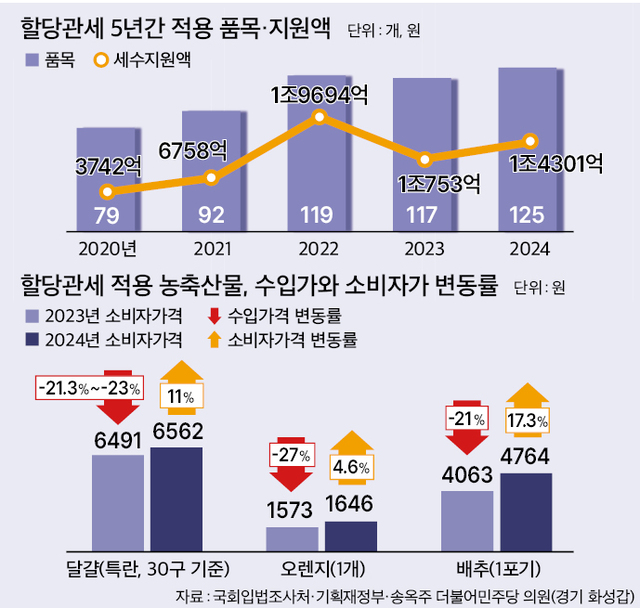 Á¤ºÎ°¡ ¹°°¡ ´ëÃ¥ÀÇ ¡®¸¸´É¿¼è¡¯Ã³·³ Ȱ¿ëÇÏ´Â ÇÒ´ç°ü¼¼µµ Á¡°ËÀÌ ¿ä±¸µÈ´Ù. ±âȹÀçÁ¤ºÎ¿¡ µû¸£¸é ÇÒ´ç°ü¼¼ Àû¿ë ǰ¸ñÀº 2020³â 79°³¿¡¼ 2024³â¿¡ 125°³·Î 58% ³Ñ°Ô ´Ã¾ú°í, ƯÈ÷ ±ä±ÞÇÒ´ç°ü¼¼°¡ °°Àº ±â°£ 2°³¿¡¼ 48°³·Î ±ÞÁõÇß´Ù. ±ä±ÞÇÒ´ç°ü¼¼´Â °¡°Ý ±Þµî µî µ¹¹ß »óȲ¿¡ ´ëÀÀÇϱâ À§ÇÑ Àӽà ¼ö´ÜÀÌÁö¸¸, ÃÖ±Ù¿¡´Â »ó½Ã ó¹æÃ³·³ ³²¹ßµÈ´Ù´Â ÁöÀûÀÌ ¸¹´Ù. ¼¼¼ö Áö¿ø¾×µµ 2020³â 3742¾ï¿ø¿¡¼ 2024³â 1Á¶4301¾ï¿øÀ¸·Î 3¹è °¡±îÀÌ ºÒ¾î³ª ¡®¼¼¼ö ÆãÅ©¡¯ ¿ì·Á¸¦ ³º°í ÀÖ´Ù.