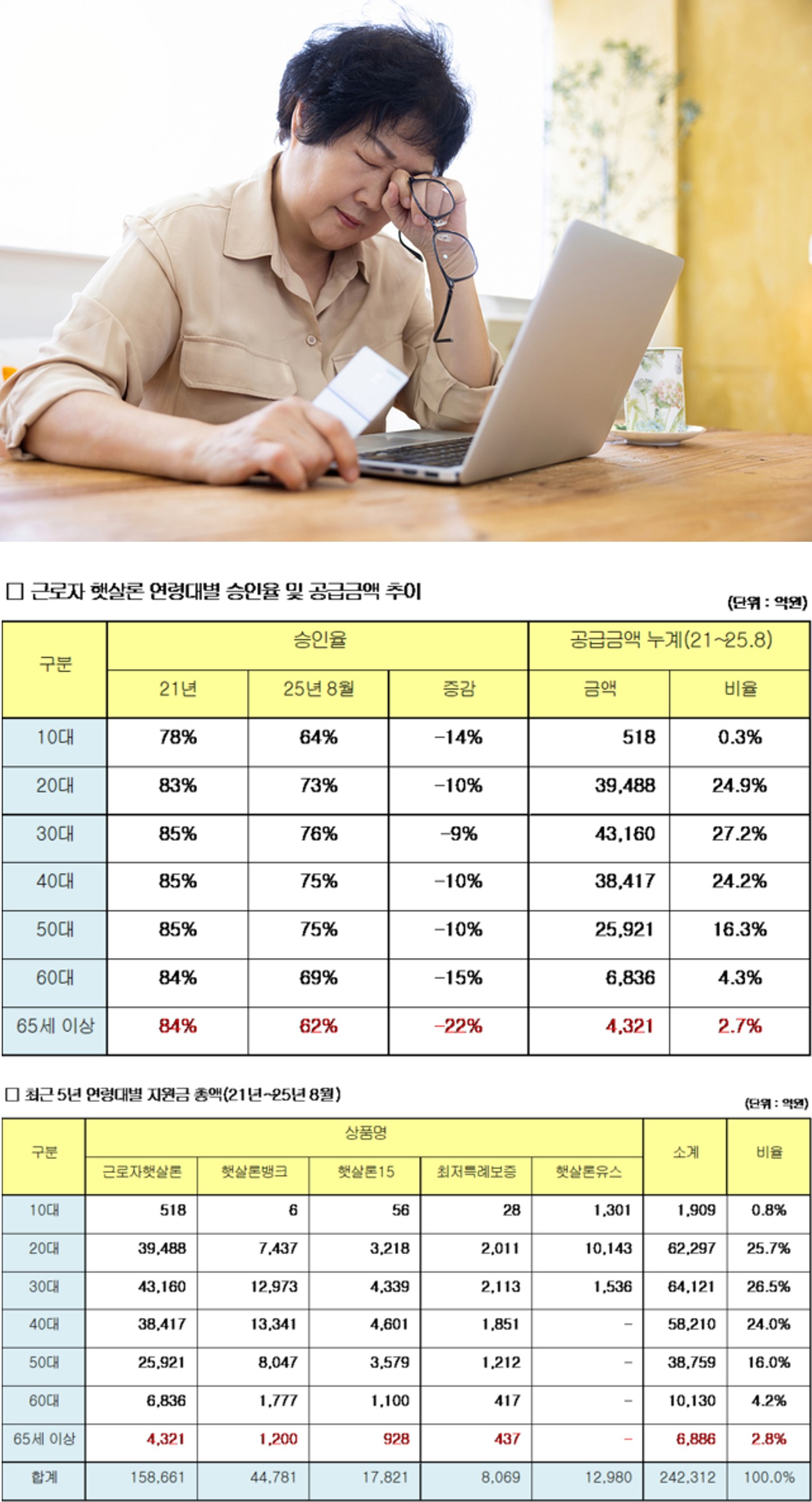 2021³âºÎÅÍ 2025³â 8¿ù±îÁö ±Ù·ÎÀÚ ÇÞ»ì·ÐÀ» ÅëÇØ °ø±ÞµÈ ÃÑ 15Á¶8661¾ï¿ø Áß 65¼¼ ÀÌ»óÀÌ ¹ÞÀº ±Ý¾×Àº 4321¾ï¿øÀ¸·Î ÀüüÀÇ 2.7%¿¡ ºÒ°úÇß´Ù. ÀÌ´Â 30´ë°¡ ¹ÞÀº ±Ý¾×ÀÇ 10ºÐÀÇ 1 ¼öÁØÀÌ´Ù.