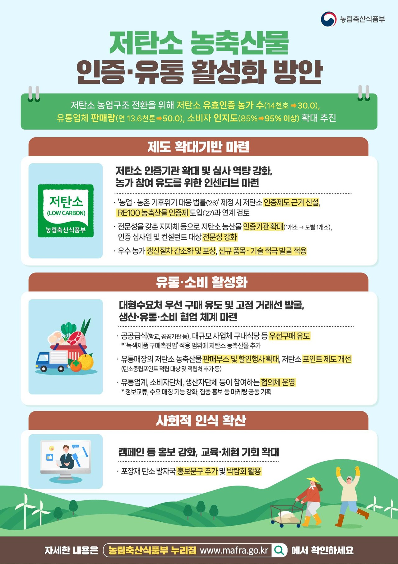 Á¤ºÎ°¡ Àúź¼Ò ³óÃà»ê¹°ÀÇ Áö¼Ó°¡´ÉÇÑ »ý»ê¡¤À¯Åëü°è È®¸³À» À§ÇØ 2030³â±îÁö Àúź¼Ò ÀÎÁõ ³ó°¡ 3¸¸È£, ¿¬°£ À¯Åë ÆÇ¸Å·® 5¸¸Åæ, ¼ÒºñÀÚ ÀÎÁöµµ 95% ÀÌ»ó ´Þ¼ºÀ» ¸ñÇ¥·Î ³»¼¼¿ü´Ù.