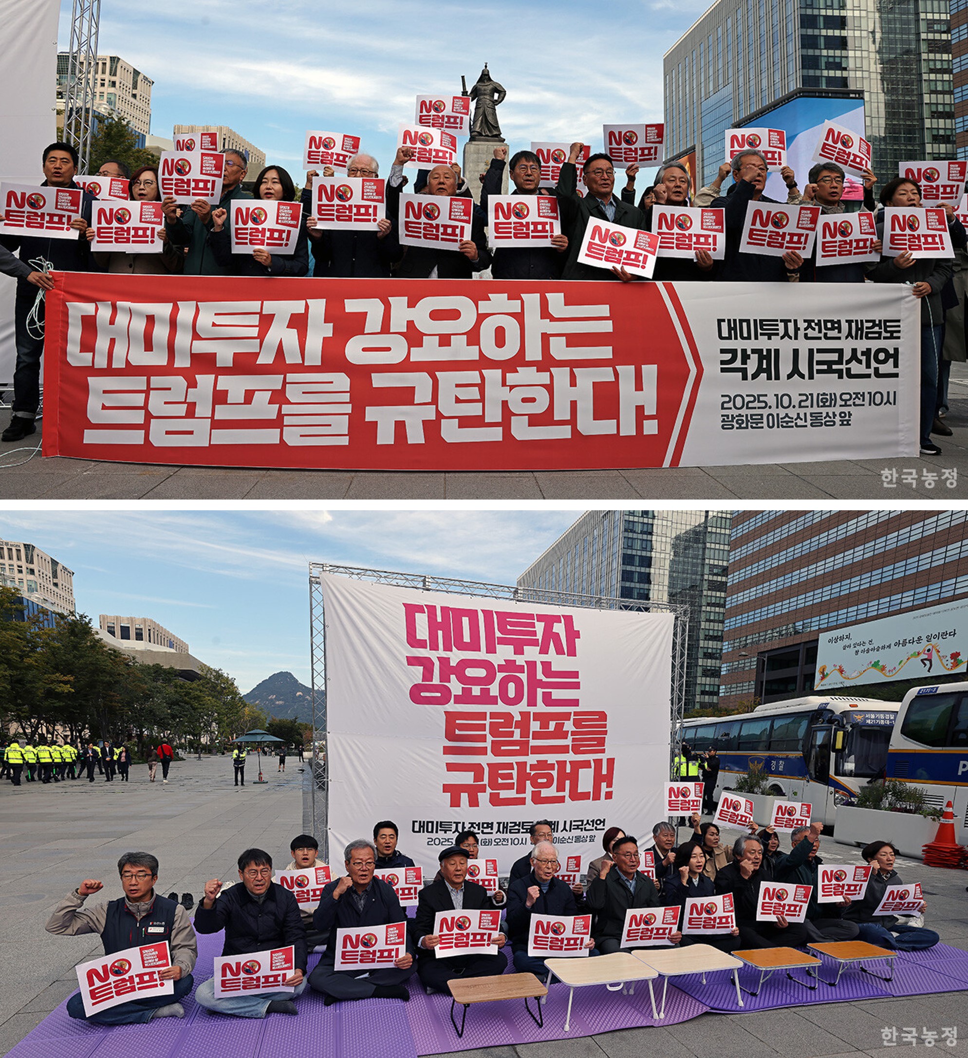 574°³ ½Ã¹Î´Üü°¡ ¸ð¿© ±¸¼ºÇÑ Æ®·³ÇÁÀ§ÇùÀúÁö°øµ¿Çൿ(°øµ¿Çൿ)Àº 21ÀÏ ¼¿ï ±¤È¹® ±¤Àå¿¡¼ °øµ¿ ±âÀÚȸ°ßÀ» ¿¾î 3500¾ï´Þ·¯ ±Ô¸ðÀÇ Á÷Á¢ ÅõÀÚ¸¦ ¿ä±¸ÇÏ´Â ¹Ì±¹ Á¤ºÎ¸¦ ±ÔźÇÏ°í ¿ì¸® Á¤ºÎ¿¡ ´ÜÈ£ÇÑ ´ëÀÀÀ» ¿ä±¸Çß´Ù. ³ó¾÷°è¿¡¼± Àü±¹³ó¹ÎȸÃÑ¿¬¸Í¡¤Àü±¹¿©¼º³ó¹ÎȸÃÑ¿¬ÇÕ ¹× ±× Áö¿ªÁ¶Á÷µéÀÌ ´ë°Å Âü¿©ÇÑ °¡¿îµ¥ °¡Å縯³ó¹Îȸ, Çѱ¹Èİè³ó¾÷°æ¿µÀÎÁß¾Ó¿¬ÇÕȸµµ À̸§À» ¿Ã·È´Ù.