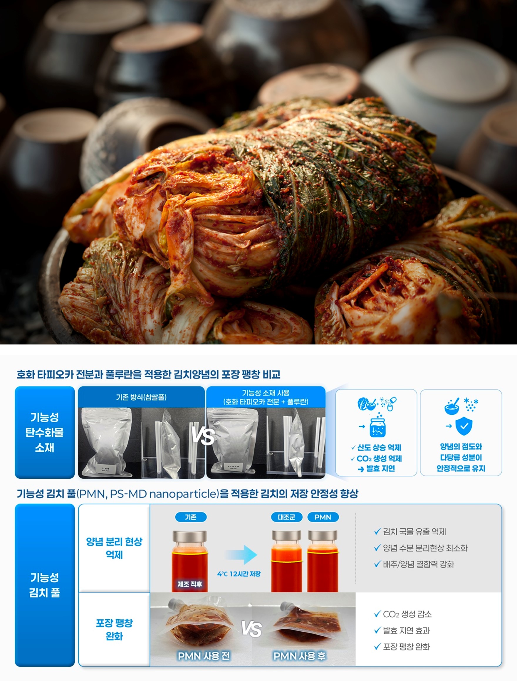 ¶ÇÇÑ ¿¬±¸ÆÀÀº Ãʰí¾Ð ±ÕÁúÈ °øÁ¤À» ÅëÇØ °¨ÀÚÀüºÐ°ú ¸»Å䵦½ºÆ®¸° È¥ÇÕ¹°À» Æò±Õ ÀÔÀÚ Å©±â 268nmÀÇ ±â´É¼º ±èÄ¡ Ç®(PMN, PS-MD nanoparticle)µµ °³¹ßÇß´Ù. PMNÀº ±ÕÀÏÇÑ ÀÔÀÚ ±¸Á¶¿Í ¿ì¼öÇÑ ¼öºÐ °áÇÕ·ÂÀ» Áö³à ±âÁ¸ Âý½ÒÇ®ÀÇ ±â´ÉÀ» º¸¿ÏÇÒ ¼ö ÀÖ´Ù. À̸¦ ±èÄ¡ Á¦Á¶¿¡ Àû¿ëÇÑ °á°ú ¹ßÈ¿ ¼Óµµ°¡ Á¶ÀýµÇ°í ÀÌ»êÈź¼Ò ¹ß»ý °¨¼Ò·Î Æ÷Àå ÆØÃ¢ Çö»ó ¿ÏÈ ¹× ±¹¹° À¯Ãâ·®ÀÌ ÃÖ´ë 40% °¨¼ÒÇÏ´Â °ÍÀ¸·Î ³ªÅ¸³µ´Ù. ¿¬±¸ÆÀÀº ÀÌ ±â¼úÀÌ ¼öÃâ µî Àå±â À¯Åë ±èÄ¡ÀÇ Ç°Áú ¾ÈÁ¤¼º Çâ»ó¿¡ È¿°úÀûÀ̶ó°í È®ÀÎÇß´Ù.