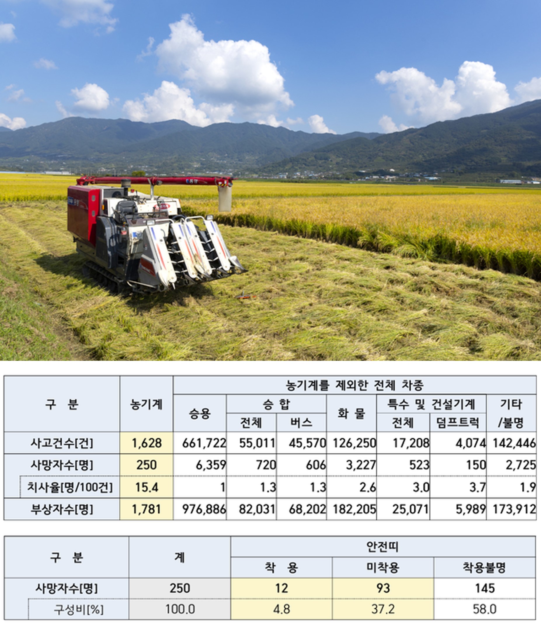 Çѱ¹µµ·Î±³Åë°ø´ÜÀÌ 21ÀÏ ¹ßÇ¥ÇÑ °ø´Ü ±³Åë»ç°í ºÐ¼®½Ã½ºÅÛ(TAAS)¿¡ µû¸£¸é ÃÖ±Ù 5³â°£(2020~2024³â) ¹ß»ýÇÑ ³ó±â°è ±³Åë»ç°í´Â 1628°ÇÀ¸·Î ÀÌ Áß »ç¸ÁÀÚ´Â 250¸í¿¡ ´ÞÇß´Ù. ±³Åë»ç°í 100°Ç´ç »ç¸ÁÀÚ ¼ö¸¦ ¶æÇÏ´Â Ä¡»çÀ²Àº 15.4·Î ³ó±â°è¸¦ Á¦¿ÜÇÑ Àüü Â÷Á¾ÀÇ Æò±Õ Ä¡»çÀ²(1.4¸í)º¸´Ù 11¹è ³ô¾Ò´Ù.