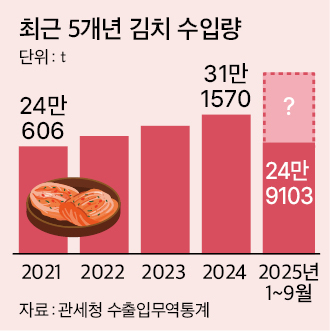 ÀÌ·± Ãß¼¼´ë·Î¶ó¸é ¿ÃÇØ ±èÄ¡ ¼öÀÔ·®Àº »ç»ó ÃÖ°íÄ¡¸¦ ÂïÀ» °¡´É¼ºÀÌ Å©´Ù. ±èÄ¡ ¼öÀÔ·®Àº 2019³â(30¸¸6050¸¸t) óÀ½À¸·Î 30¸¸t º®À» ²£´Ù. ÀÌÈÄ Äڷγª19 ½Ã±â¸¦ °ÅÄ¡¸é¼ 20¸¸t´ë·Î ³»·Á¾É¾ÒÁö¸¸ Áö³ÇØ 31¸¸1570¸¸tÀ¸·Î ¿ª´ë ÃÖ°íÄ¡¸¦ ½è´Ù.