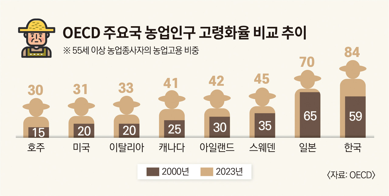 Çѱ¹ÀÇ °æ¿ì 2000³â 59%¿´´ø 55¼¼ ÀÌ»ó ³ó¾÷ÀÎ ºñÁßÀÌ 2023³â 84%·Î ±ÞµîÇÏ´Â µî °í·ÉÈ ¼Óµµ°¡ °¡ÆÄ¸£´Ù. ÀüüÀûÀ¸·Î´Â Áö³ 20³â°£ ¿À½ºÆ®¸®¾Æ¿Í Å©·Î¾ÆÆ¼¾Æ¸¦ Á¦¿ÜÇÑ ´ëºÎºÐ ±¹°¡¿¡¼ °í·É ³ó¾÷ÀÎ ºñÁßÀÌ Áõ°¡ÇÑ °ÍÀ¸·Î ³ªÅ¸³µ´Ù.