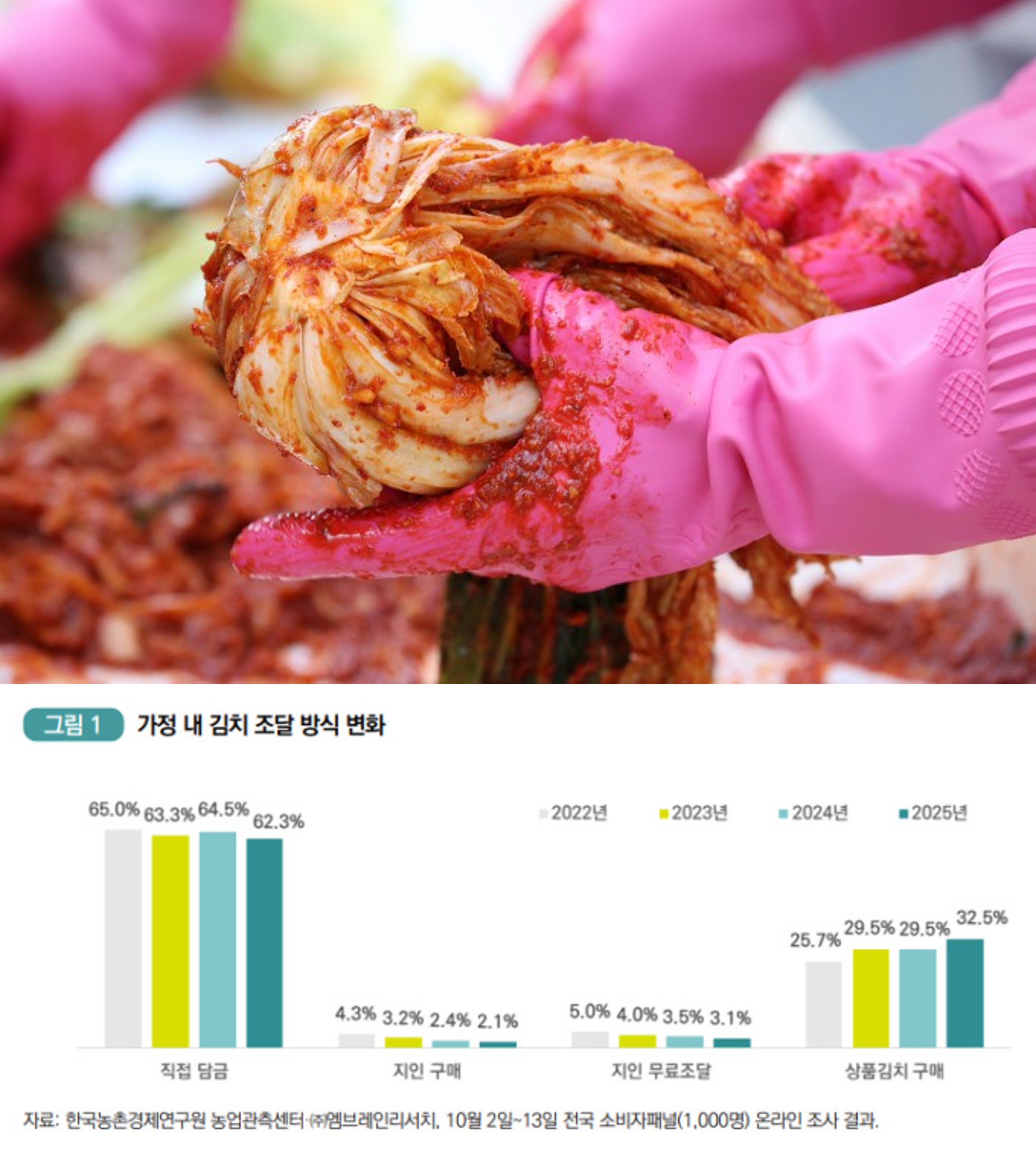 ±èÄ¡¸¦ Á÷Á¢ ´ã±×´Â °¡±¸´Â ÀüüÀÇ 62.3%·Î Àü³â(64.5%)º¸´Ù ÁÙ¾ú°í, »óǰ±èÄ¡¸¦ ±¸¸ÅÇÏ´Â °¡±¸´Â 32.5%·Î Àü³â(29.5%)º¸´Ù ´Ã¾ú´Ù. Áö³ 2022³â ÀÌÈÄ »óǰ±èÄ¡ ±¸¸Å ºñÀ²Àº ²ÙÁØÈ÷ Áõ°¡ÇÏ´Â Ãß¼¼´Ù. ÁöÀÎÀ¸·ÎºÎÅÍ ±èÄ¡¸¦ ±¸¸ÅÇϰųª ¹«·á·Î Á¶´Þ¹Þ´Â °¡±¸´Â 4% ¹Ì¸¸À¸·Î, ¼ÒºñÀÚÀÇ ±èÄ¡ Á¶´Þ ¹æ½ÄÀº ''Á÷Á¢ ´ã±Ý''°ú ''»óǰ±èÄ¡ ±¸¸Å''·Î ¾çºÐµÆ´Ù.