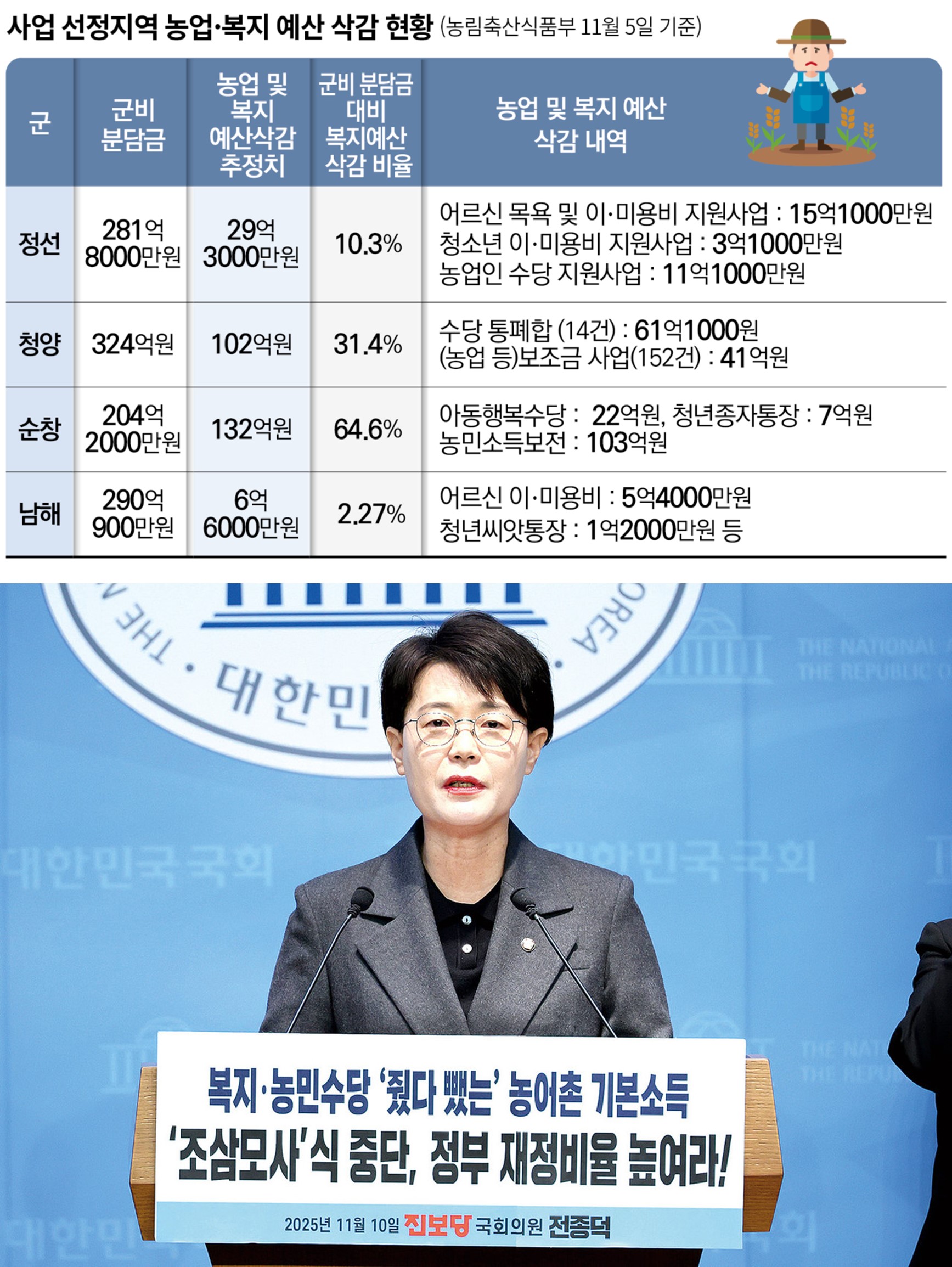 Àü ÀÇ¿øÀº ¡°Áö¿ª º¹Áö¿Í ³ó¾÷ ¿¹»êÀ» ÁÙÀÌ´Â ¹æ½ÄÀº ´Ü¼øÇÑ ¿¹»ê Á¶Á¤ÀÌ ¾Æ´Ï¶ó ³ó¾÷¡¤³óÃÌÀÇ °øÀÍÀû °¡Ä¡¸¦ ÈѼÕÇÏ´Â Á¤Ã¥Àû ¿ªÇࡱÀ̶ó¸ç ¡°³ó¾îÃ̱⺻¼Òµæ ½Ã¹ü»ç¾÷À» ±¹ºñ 40%, Áö¹æºñ 60% ºÎ´ã ±¸Á¶·Î ¼³°èÇÑ Á¤ºÎÀÇ Ã¥ÀÓ È¸Çǰ¡ ³ºÀº °á°ú¡±¶ó°í ºñÆÇÇß´Ù.