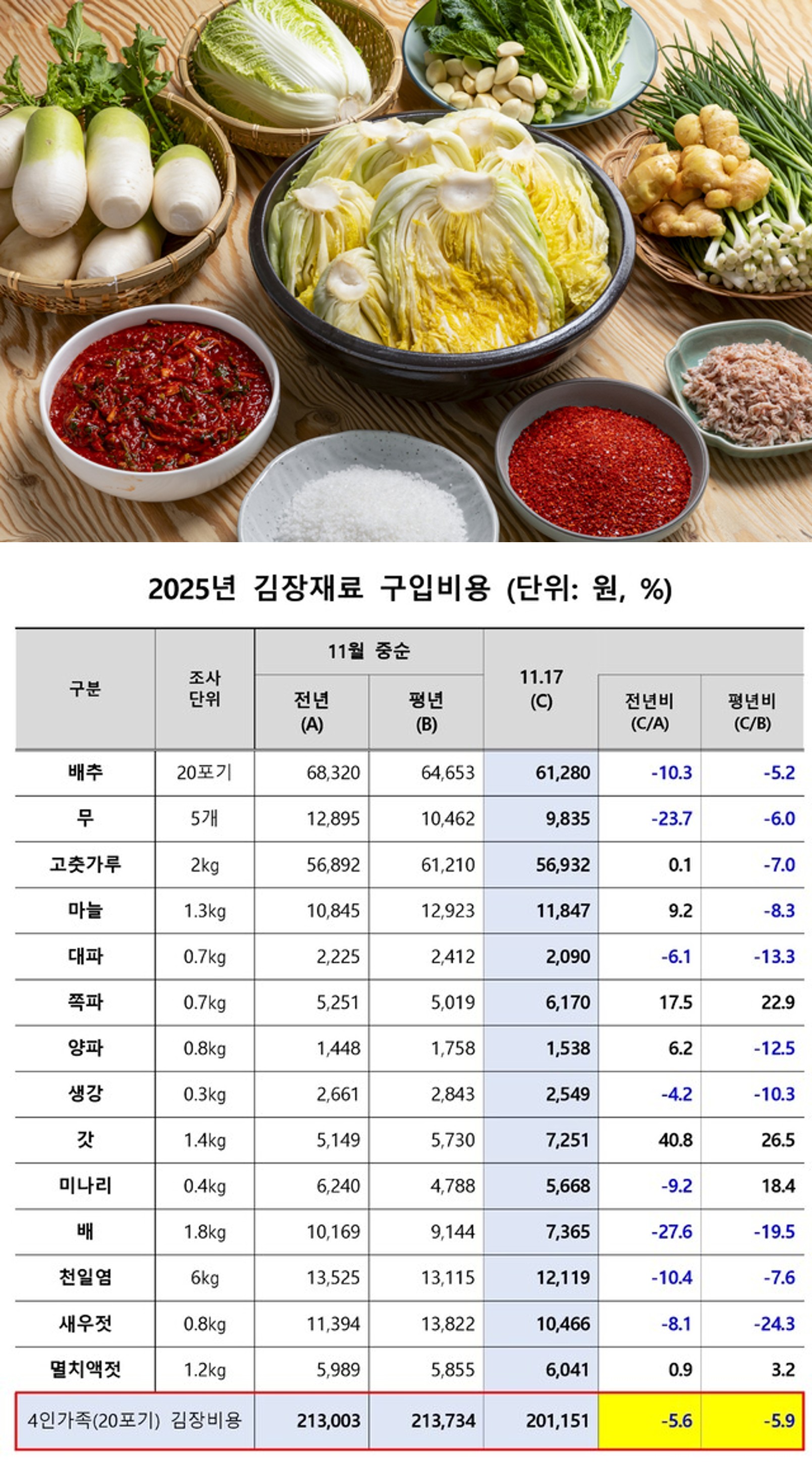 Çѱ¹³ó¼ö»ê½ÄǰÀ¯Åë°ø»ç(aT)°¡ 18ÀÏ ¹ßÇ¥ÇÑ ±èÀåºñ¿ë Á¶»ç °á°ú¿¡ µû¸£¸é 17ÀÏ ±âÁØ 4ÀÎ °¡±¸(20Æ÷±â) ±èÀåºñ¿ëÀº 20¸¸1151¿øÀ¸·Î Áý°èµÆ´Ù. Àü³â µ¿±â(21¸¸3003¿ø) ´ëºñ 5.6% ³·¾ÆÁø ¼öÄ¡´Ù.