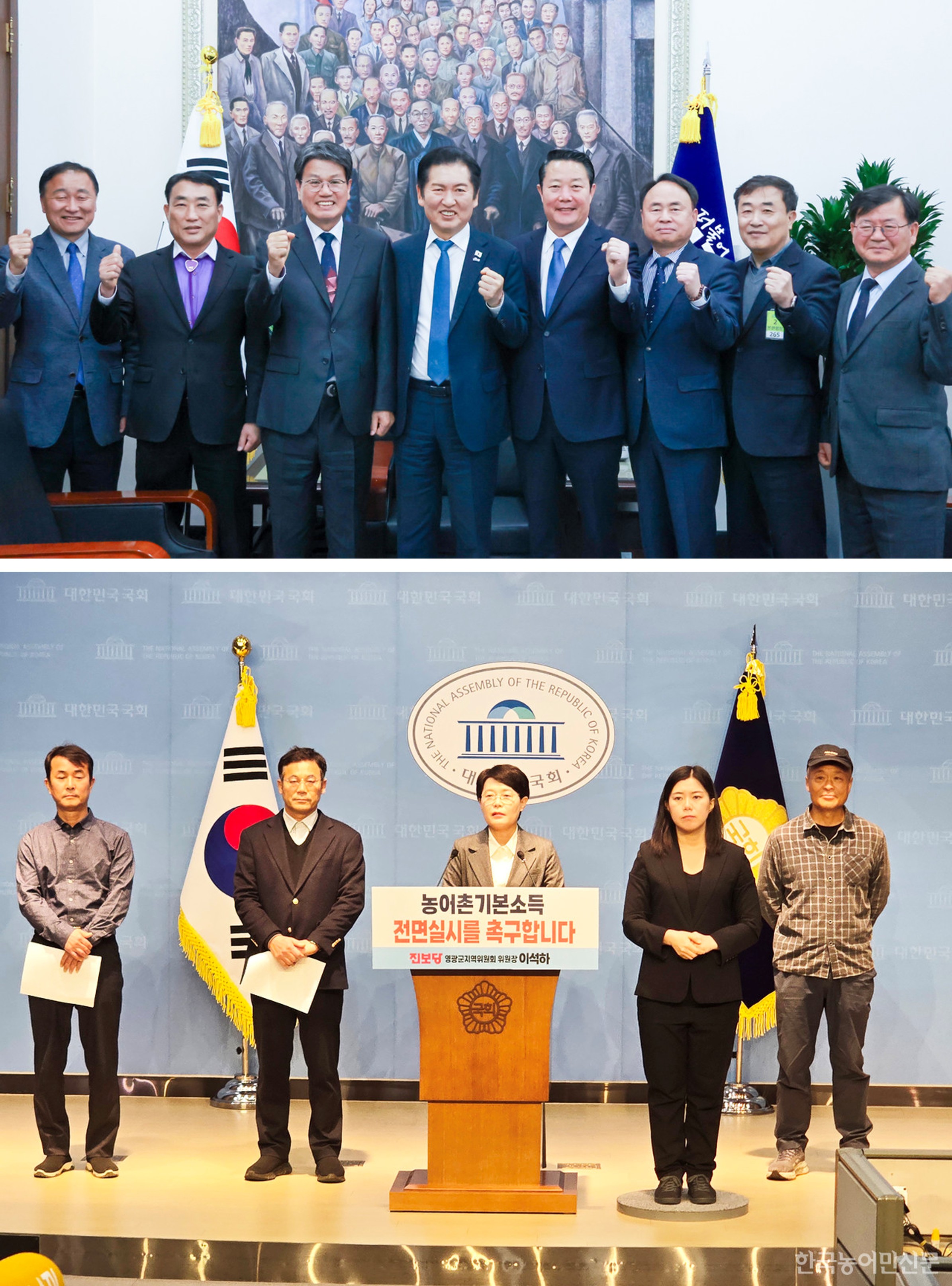 * Á¤Ã»·¡ ¹ÎÁÖ´ç ´ëÇ¥(¿ÞÂÊ¿¡¼ 4¹øÂ°)¿Í ³ó¾îÃ̱⺻¼Òµæ ½Ã¹ü»ç¾÷ ¼±Á¤ 7°³ ±º ´ÜüÀåµéÀÌ 17ÀÏ ±¹È¸¿¡¼ ¸¸³ª ±¹ºñ »óÇâ µîÀ» ÇùÀÇÇß´Ù. »çÁø=û¾ç±º