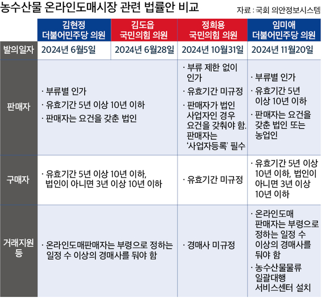 ±¹È¸ ÀǾÈÁ¤º¸½Ã½ºÅÛ¿¡ µû¸£¸é ±¹È¸¿¡¼± ³ó¼ö»ê¹° ¿Â¶óÀεµ¸Å½ÃÀå °ü·Ã ¹ý·ü Á¦Á¤¾ÈÀÌ 26ÀÏ ±âÁØ ¸ðµÎ 4°Ç ¹ßÀǵƴÙ. ±èÇöÁ¤ ´õºÒ¾î¹ÎÁÖ´ç ÀÇ¿ø(°æ±â ÆòÅú´)ÀÌ Áö³ÇØ 6¿ù ¡®³ó»ê¹° ¿Â¶óÀεµ¸Å°Å·¡ ÃËÁø¿¡ °üÇÑ ¹ý·ü¾È¡¯À» ´ëÇ¥ ¹ßÀÇÇÑ ÀÌÈÄ ±¹¹ÎÀÇÈû ±èµµÀ¾(ºÎ»ê °¼)¡¤Á¤Èñ¿ë(°æºÏ °í·É ¼ºÁÖ¡¤Ä¥°î) ÀÇ¿ø, ÀÓ¹Ì¾Ö ¹ÎÁÖ´ç ÀÇ¿ø(ºñ·Ê´ëÇ¥)ÀÌ Áö³ÇØ 11¿ù±îÁö Â÷·Ê·Î °ü·Ã ¹ý·ü¾ÈÀ» ´ëÇ¥ ¹ßÀÇÇß´Ù.