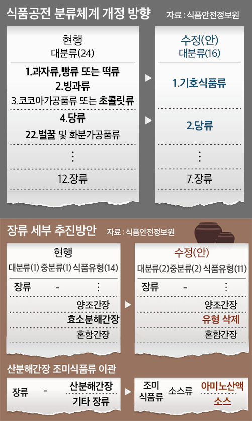 ¡ß½Äǰ´ç±¹ÀÌ °³Á¤ ÃßÁøÇÏ¸ç ¹®Á¦ ºÒ°ÅÁ®=½Äǰ°øÀü ºÐ·ùü°è °³Á¤ ¹®Á¦°¡ ÀüÅëÀå·ù¾÷°è¿¡¼ º»°ÝÀûÀ¸·Î ºÒ°ÅÁø °Ç 8¿ù13ÀÏ·Î °Å½½·¯ ¿Ã¶ó°£´Ù. ½Äǰ¾ÈÀüÁ¤º¸¿øÀÌ ¡®½Äǰ°øÀü ºÐ·ùü°è ¹× ±âÁØ±Ô°Ý °³¼± Á¦5Â÷ »ê¾÷°è ÀÚ¹®´Ü ȸÀÇ¡¯¸¦ ¿¾î ½Äǰ°øÀü ´ëºÐ·ù¿¡¼ Àå·ù¸¦ »èÁ¦ÇÏ´Â ´ë½Å ±âÁ¸ ´ëºÐ·ù Ç׸ñÀÎ Á¶¹Ì½Äǰ·ù ¾Æ·¡ Áߺзù·Î¼ Àå·ù¸¦ ¹èÄ¡ÇÏ´Â ¹æ¾ÈÀ» ³»³ù´Ù. ¶ÇÇÑ ÇØ´ç ¾È¿¡´Â ¼ÒºÐ·ù¿¡¼ ¡®ÇѽĸÞÁÖ¡¯ ¡®Çѽİ£À塯 ¡®ÇѽĵÈÀ塯À» °¢°¢ ¡®°³·®¸ÞÁÖ¡¯ ¡®¾çÁ¶°£À塯 ¡®°³·®µÈÀ塯°ú ¹¾î ¡®¸ÞÁÖ¡¯ ¡®°£À塯 ¡®µÈÀ塯À¸·Î ÅëÆóÇÕÇÏ´Â ³»¿ëµµ ´ã°å´Ù.