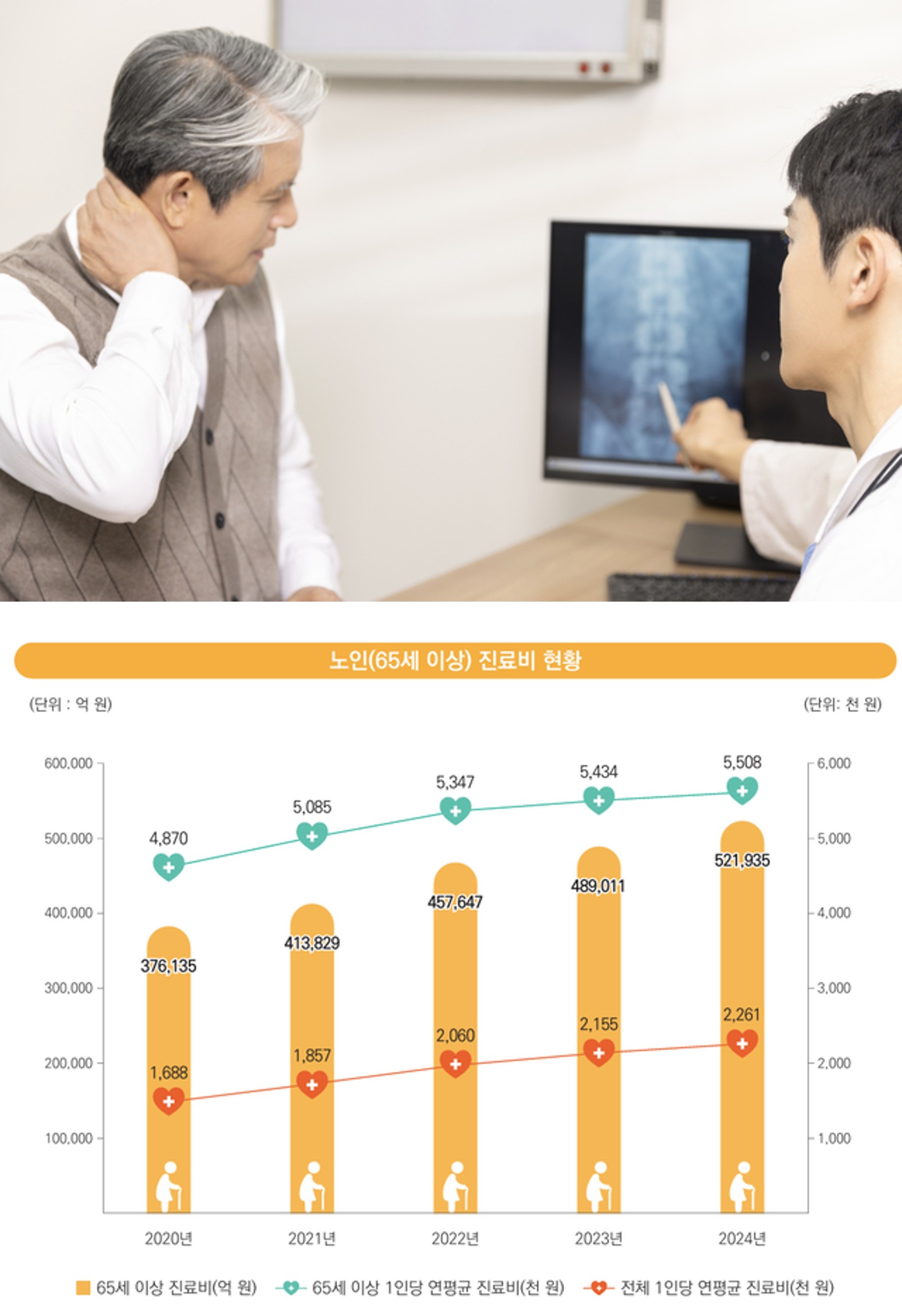 ¿¬·É´ëº°´Â 65¼¼ ÀÌ»ó Áø·áºñ°¡ 52Á¶1935¾ï¿øÀ¸·Î Àü³âº¸´Ù 6.7% ´Ã¾ú´Ù. Àα¸ °í·ÉÈ¿¡ µû¶ó ³ëÀÎ Áø·áºñ´Â ¡ã2020³â 37Á¶6135¾ï¿ø ¡ã2021³â 41Á¶3829¾ï¿ø ¡ã2022³â 45Á¶7647¾ï¿ø ¡ã2023³â 48Á¶9011¾ï¿øÀ¸·Î ¸Å³â Áõ°¡ÇؿԴÙ. ³ëÀÎ 1ÀÎ´ç ¿¬Æò±Õ Áø·áºñ´Â 550¸¸8000¿ø¿¡ ´ÞÇÑ´Ù.
