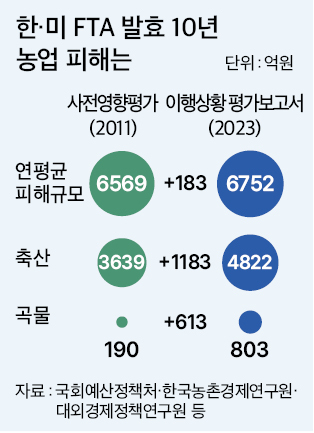 ƯÈ÷ ÇÑ¡¤¹Ì FTA´Â »çÀü ÃßÁ¤º¸´Ù ½ÇÁ¦ ÇÇÇØ°¡ ´õ Å« °ÍÀ¸·Î ³ªÅ¸³µ´Ù. 2011³â »çÀü ¿µÇâÆò°¡¿¡¼± ÇÇÇØ±Ô¸ð¸¦ 6569¾ï¿øÀ¸·Î ¿¹»óÇßÀ¸³ª 2023³â ½ÇÁ¦ ºÐ¼®¿¡¼± ¹ßÈ¿ ÀÌÈÄ 10³â°£(2012~2021³â) ¿¬Æò±Õ 6752¾ï¿øÀ¸·Î È®ÀεŠ183¾ï¿ø Â÷À̰¡ ³µ´Ù. ǰ¸ñº°·Î´Â Ãà»ê°ú °î¹°¿¡¼ Áõ°¡ÆøÀÌ ¶Ñ·ÇÇß´Ù. Ãà»êÀº 3639¾ï¿ø¿¡¼ 4822¾ï¿øÀ¸·Î 1183¾ï¿ø ´Ã¾ú°í, °î¹°Àº 190¾ï¿ø¿¡¼ 803¾ï¿øÀ¸·Î 613¾ï¿ø Áõ°¡Çß´Ù.